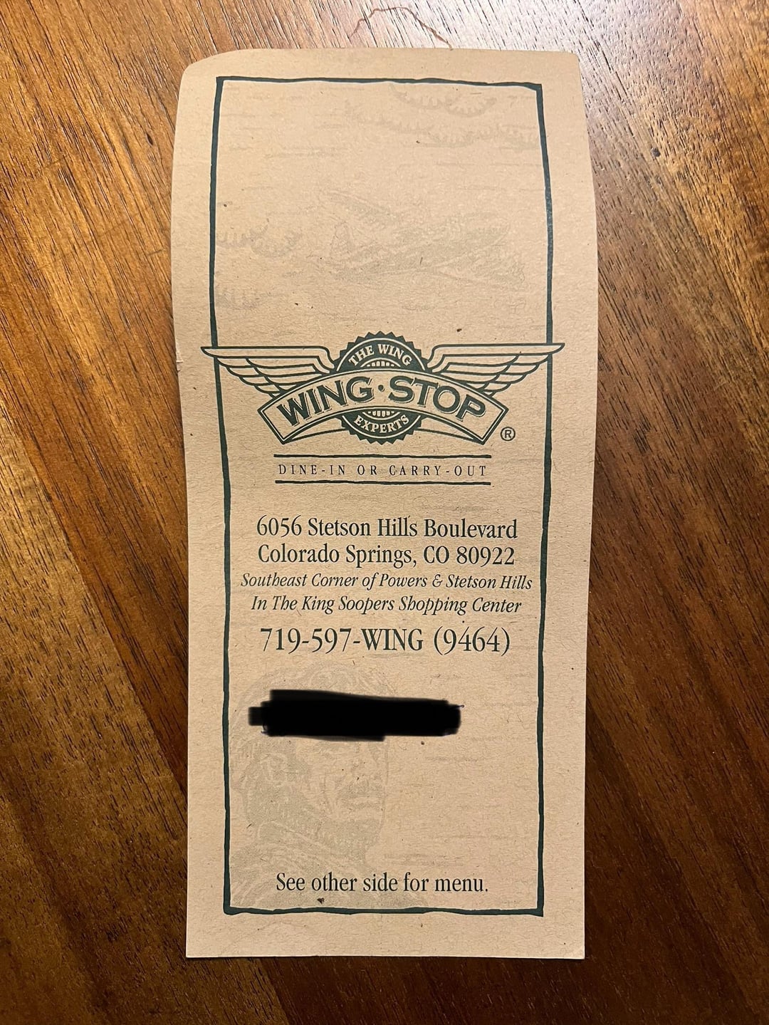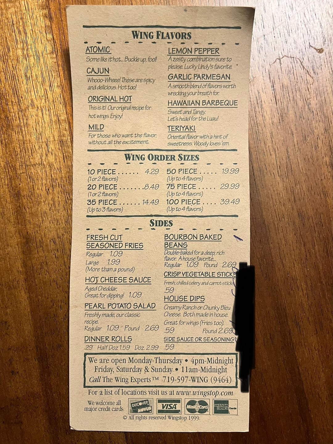 Found this menu in a box of my old man’s stuff. Wingstop and Frickers were his favorites.