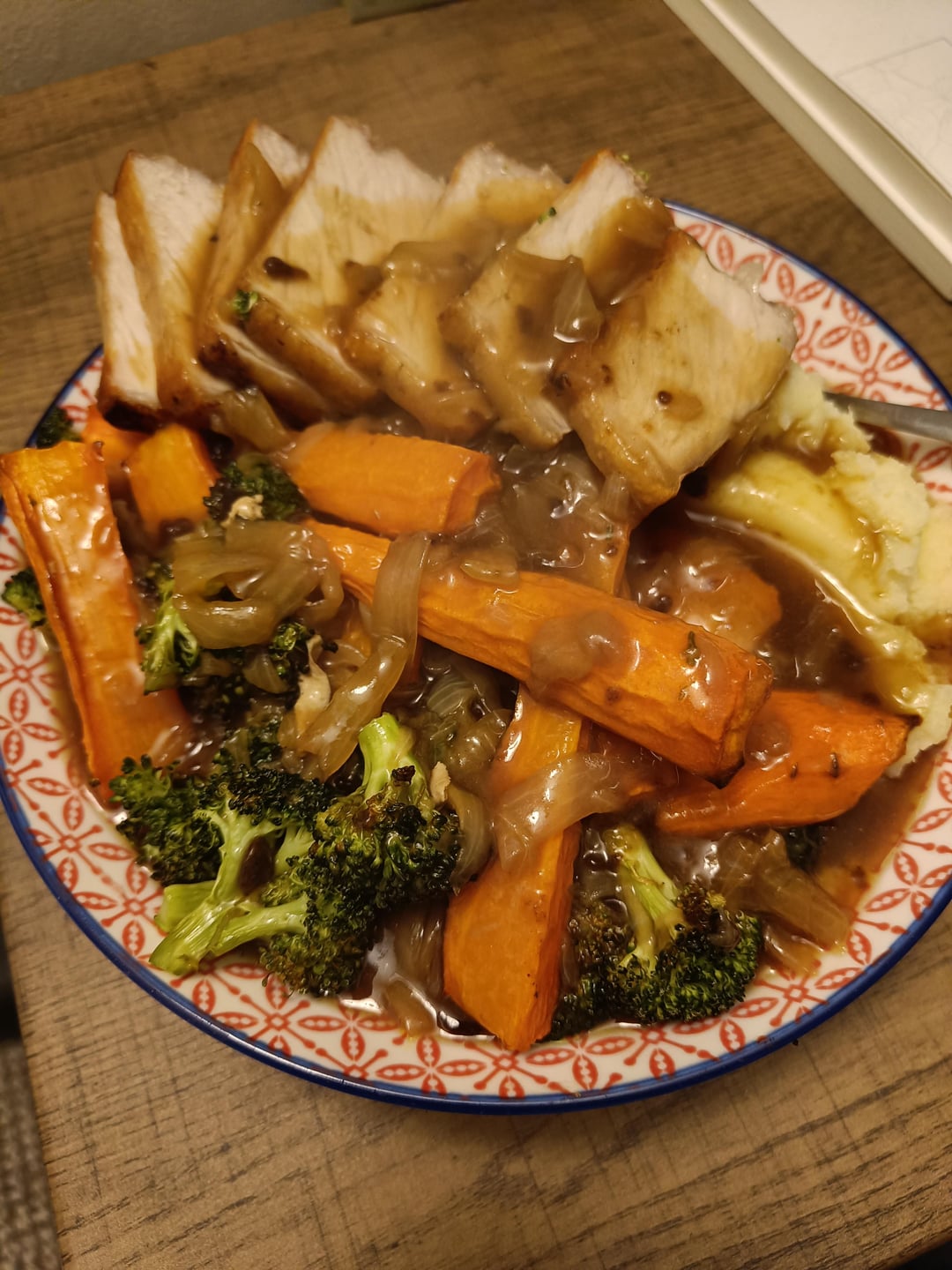 That pork is kinda funny looking. I am guessing its a reformed joint as a square joint with fat all round isn’t really a thing. It all looks very tasty though.