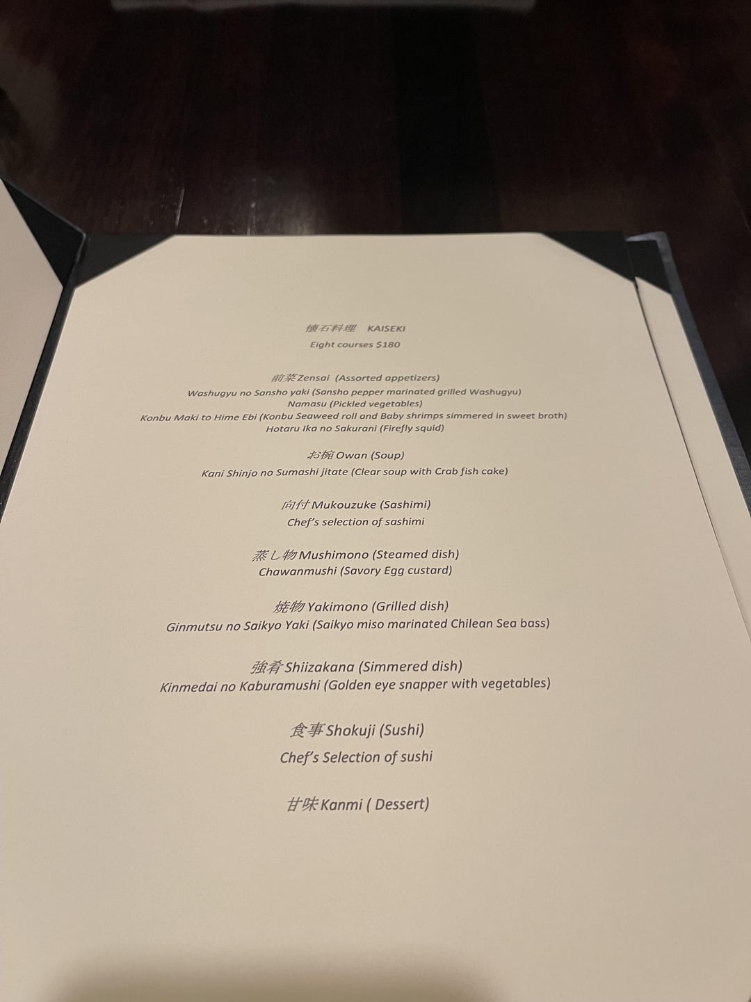 8 course meal for $180 Short walk from downtown Decent street parking and amazing service! Made a reservation through Yelp day of (Saturday) and had a great experience.Pictured in order served. Description in pic #9 🙂 by OrangePeelSpiral Write A CommentYou must be logged in to post a comment.