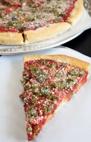 This sounds like it could be pretty good as a riff on a tomato pie. If the sauce is good, they use real Parmesan, and the peppers are crunchy, I’d eat this.