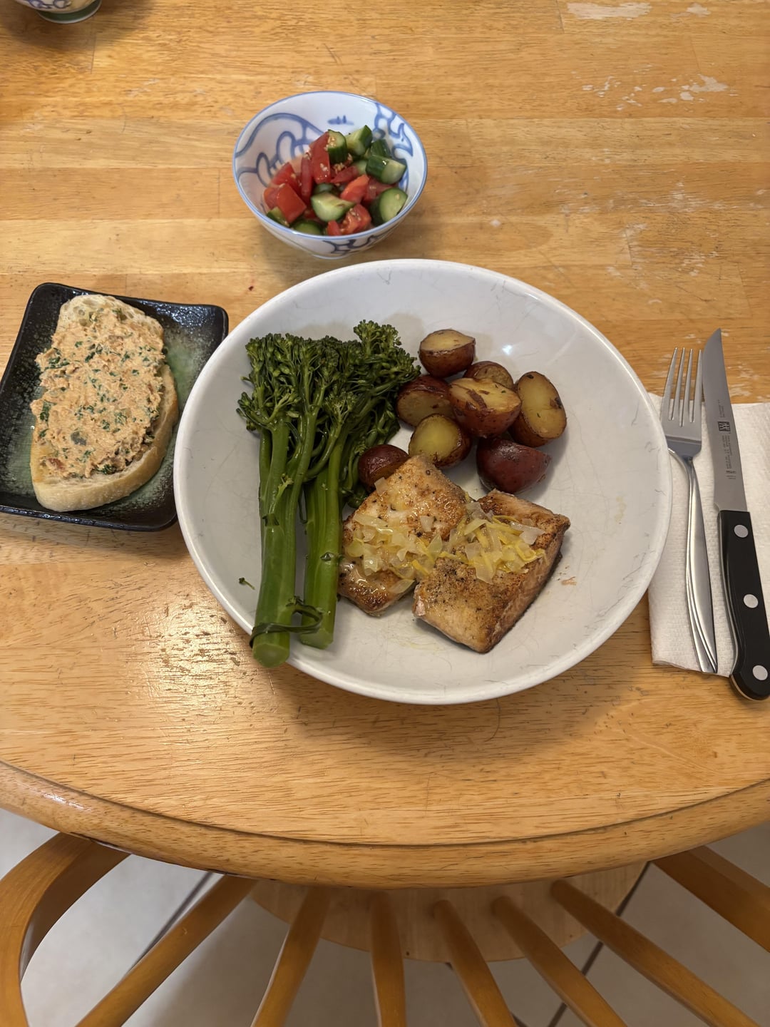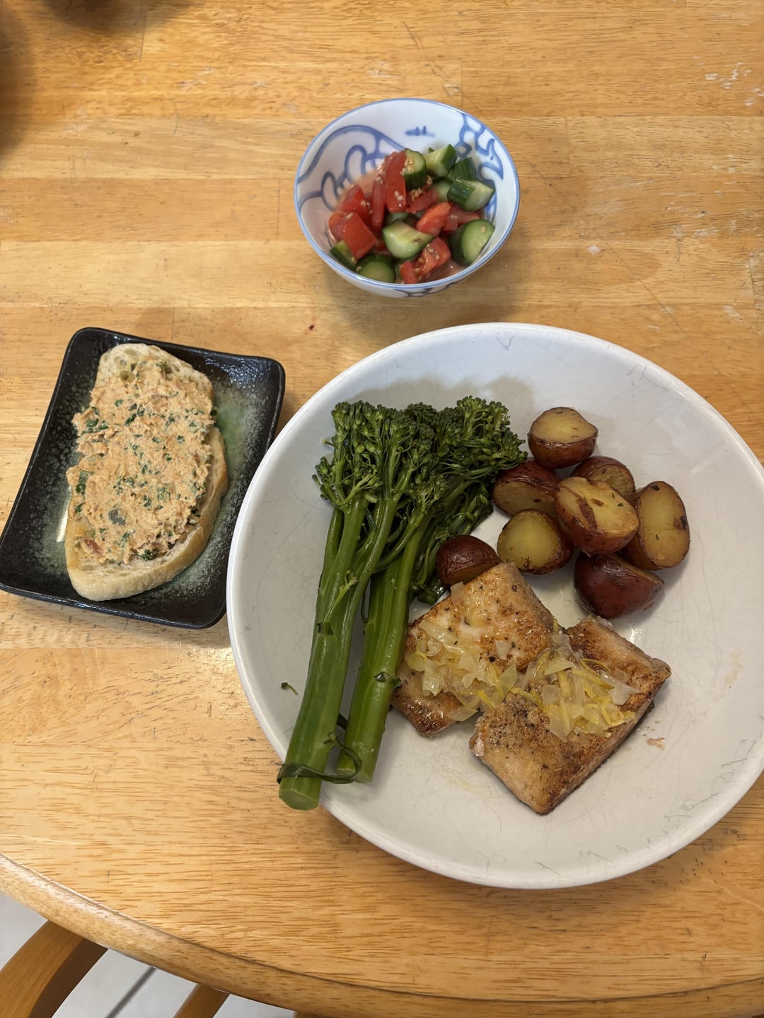 (2) The meal: Grilled Mahi-Mahi with lemon sauce, duck fat roasted potatoes, broccolini and Tuna Rillette Tapa