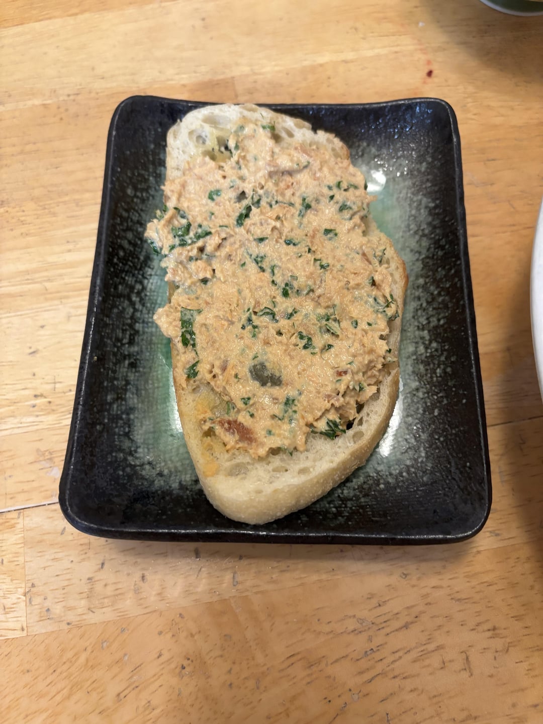 The fish out of the jar has a pleasant texture, not at all like pork paté. The texture is smooth, without being baby-foody. The tuna flavor is light, not fatty, but still unctuous and elevated – the spices in the jar work well with the tuna, but I thought it needed some fat, some acid, and a pop of fresh herbs.