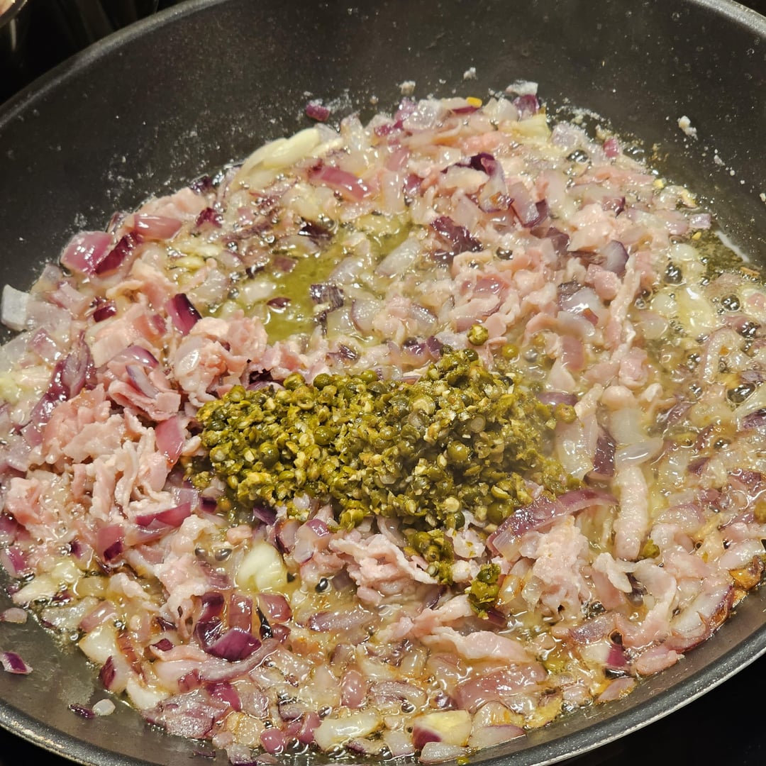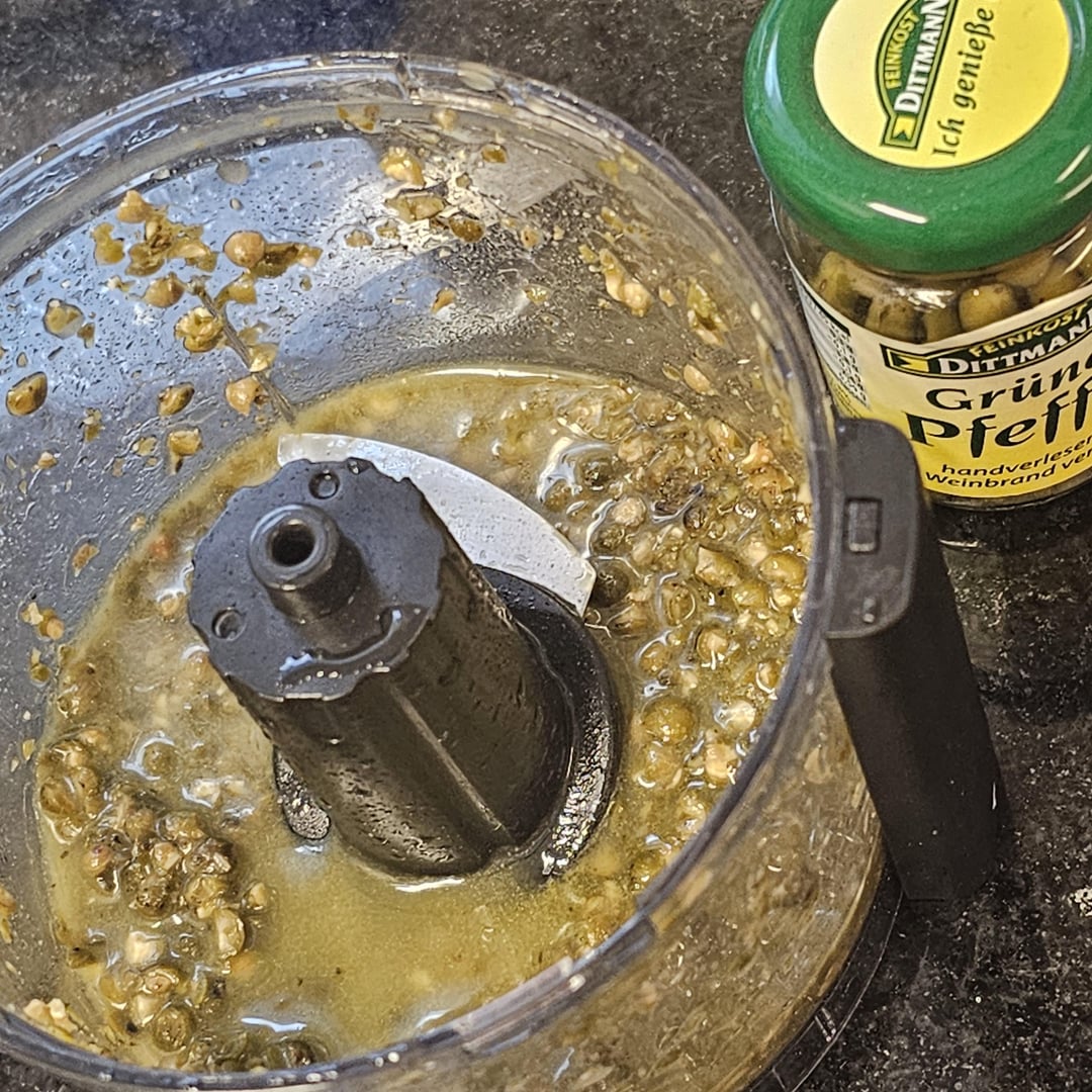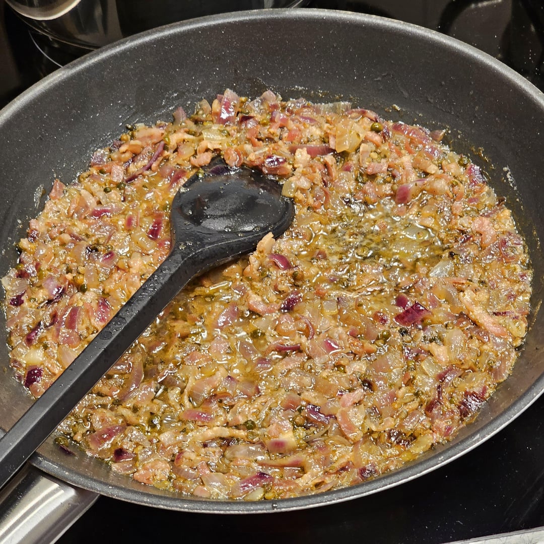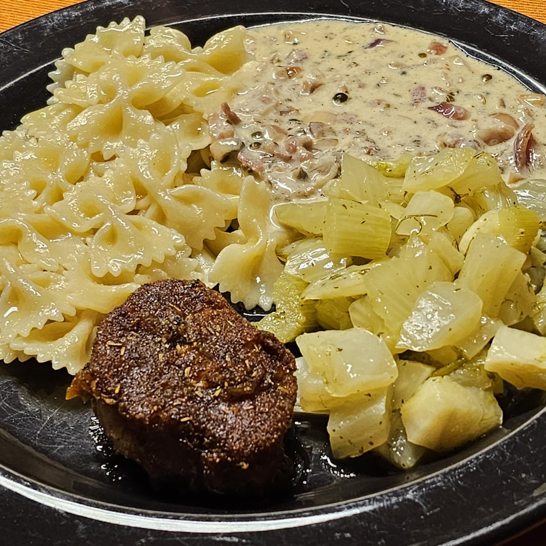 Low-temperature cooked pork tenderloin medallions in a spicy sauce made from whole green peppercorns, cognac, bacon, white wine and onions, served with lemony fennel and farfalle.