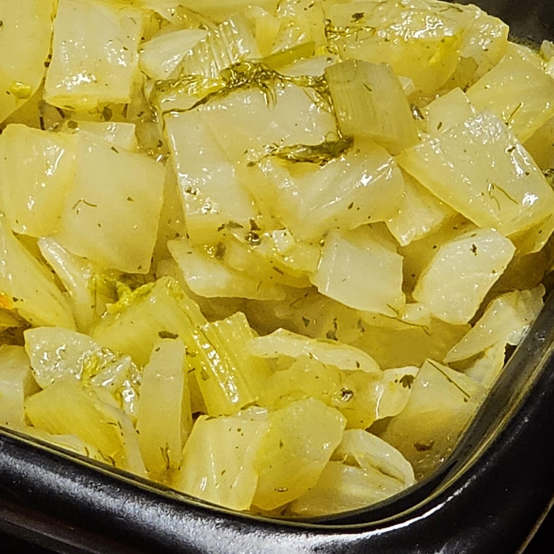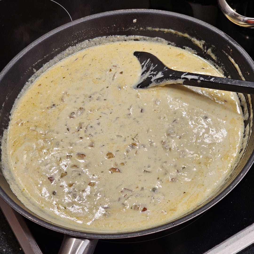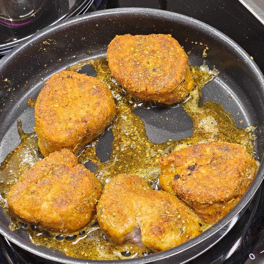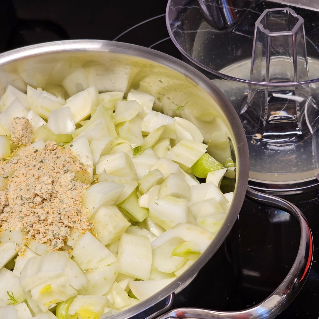 Low-temperature cooked pork tenderloin medallions in a spicy sauce made from whole green peppercorns, cognac, bacon, white wine and onions, served with lemony fennel and farfalle.
