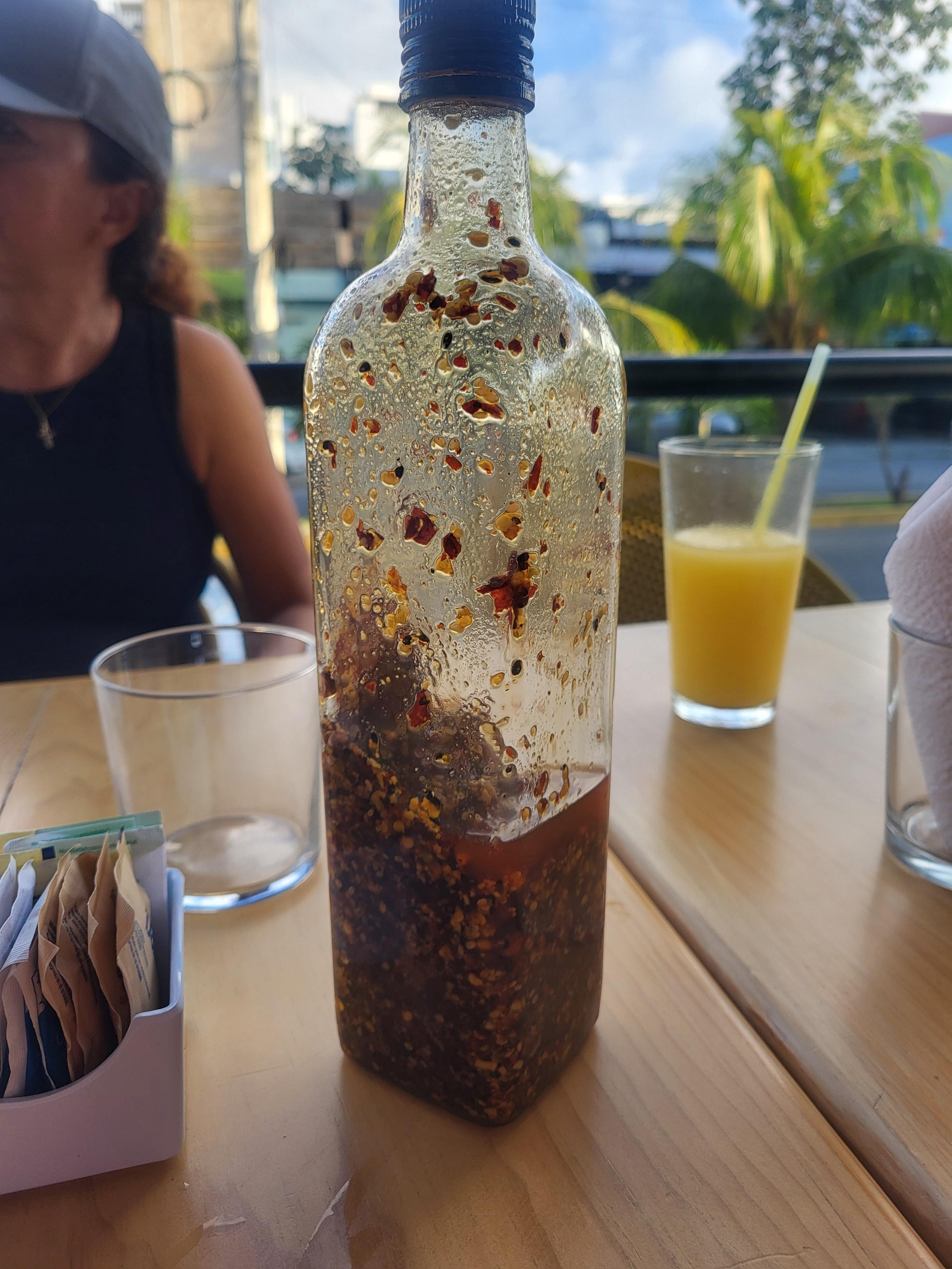 I’m in Mexico at an Italian restaurant and this chili oil was on the table. It was so good to dip bread in.