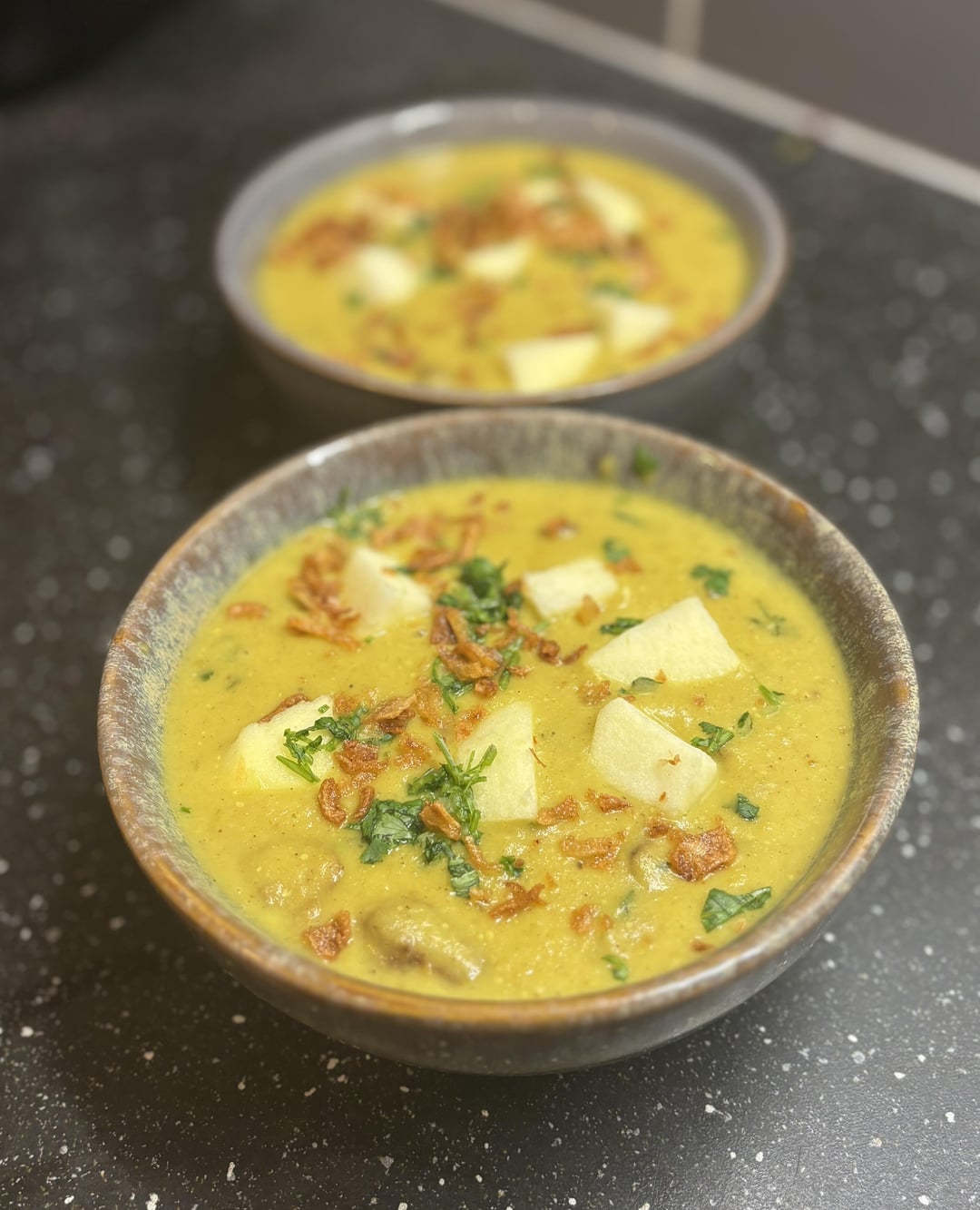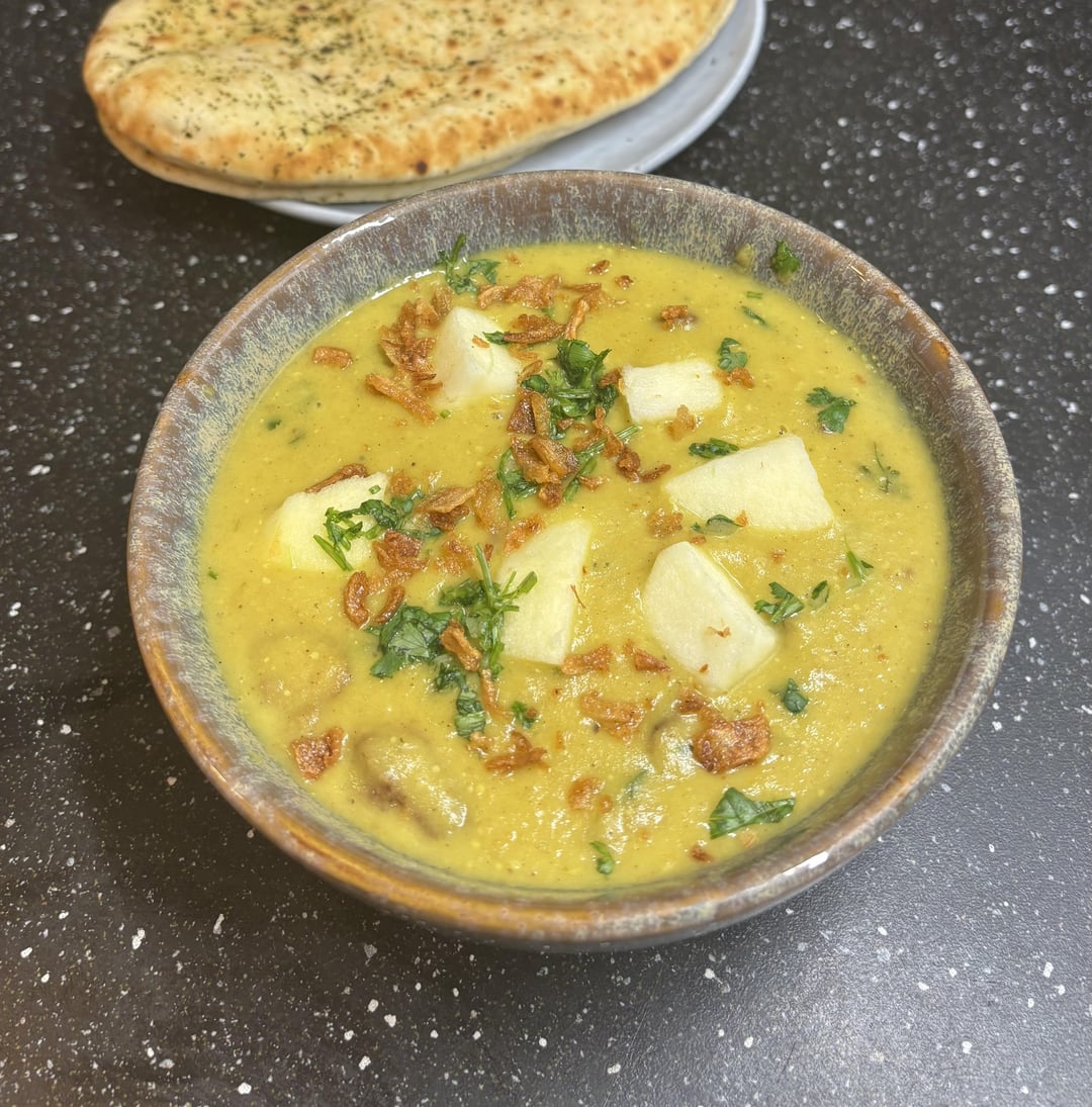 Potato leek curry soup with naan bread