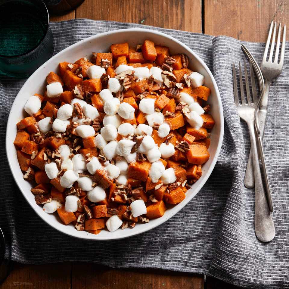 The genius hack in this recipe: topping sweet potatoes with marshmallows while they’re still piping hot from the slow cooker yields a baked marshmallow topping that’s typical with baked sweet potato casseroles.