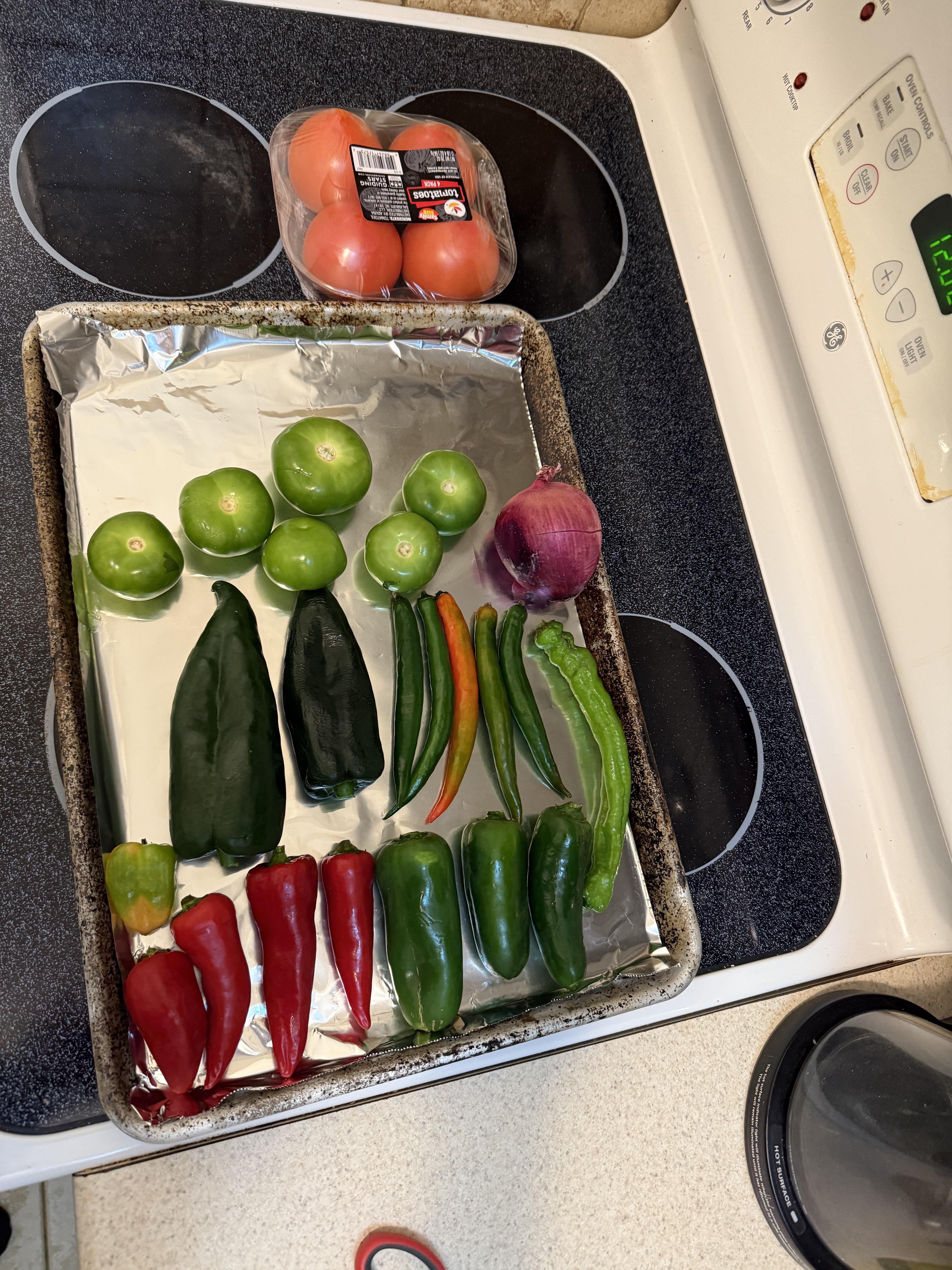 2 Tomatoes, 6 Tomatillos, 1 Red Onion, 1 Long Hot, 5 Serrano’s, 2 Poblano’s, 3 Jalapeños, 4 Habaneros,