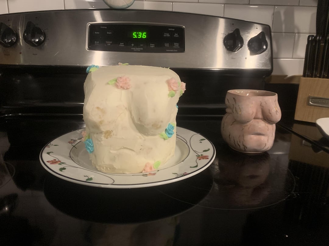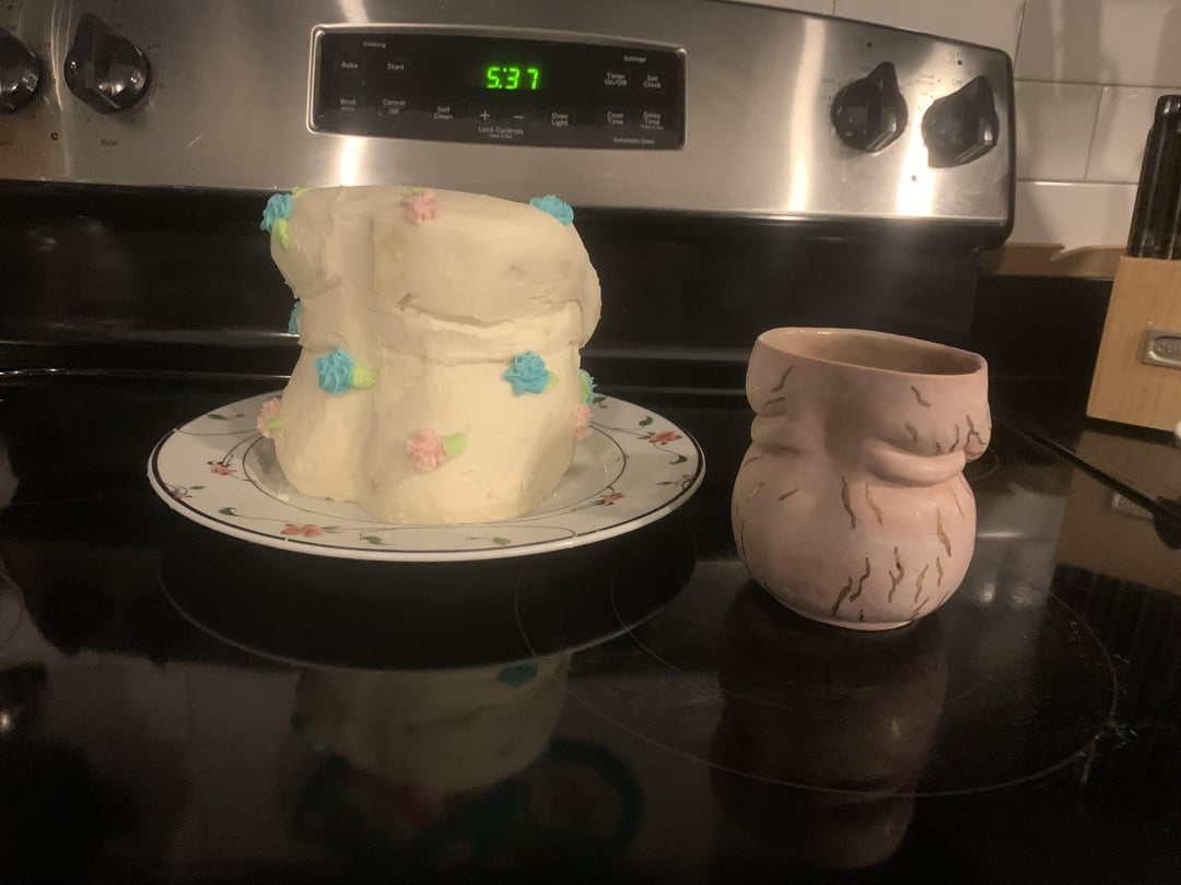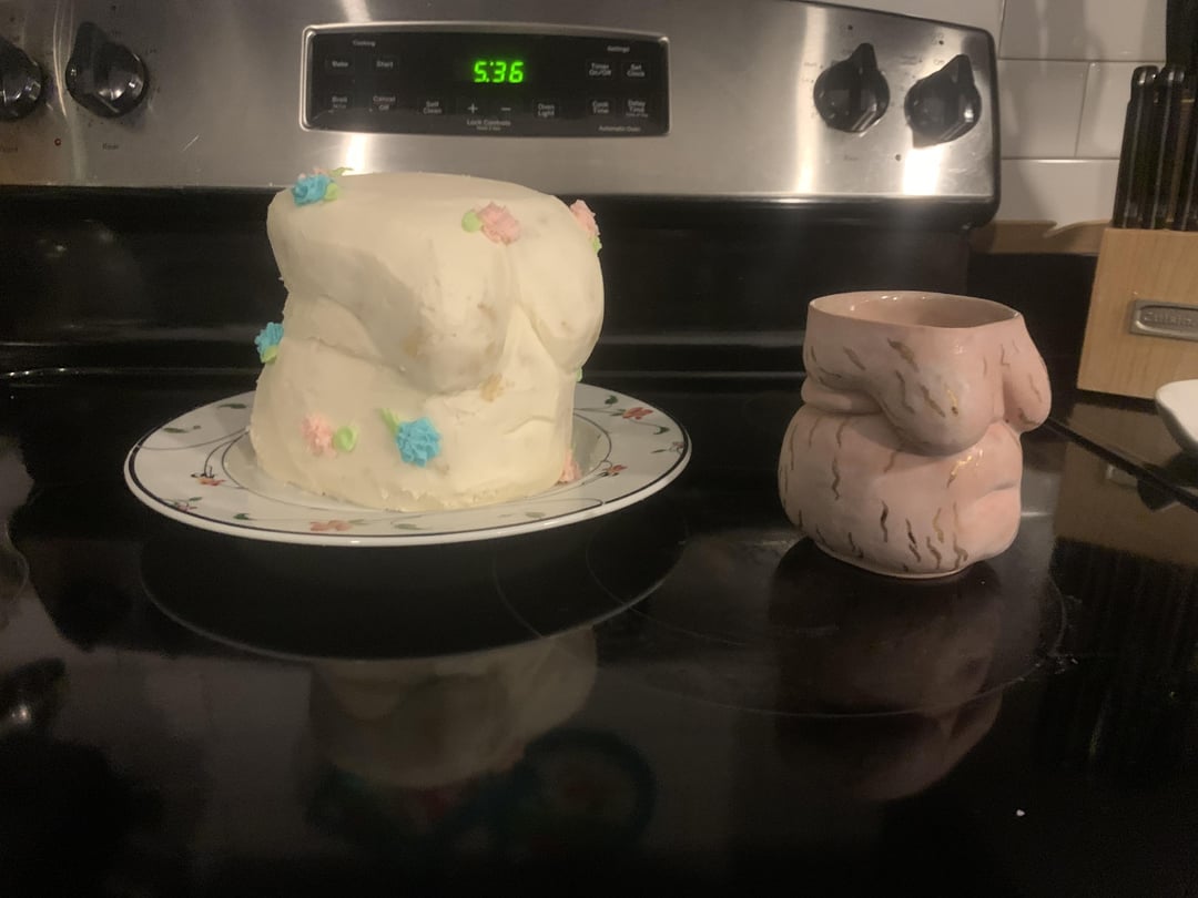 My ceramics instructor (I'm an adult and the classes aren't associated with a school, just a studio) makes these awesome body mugs and it's her birthday today, our last day of class, when she only moved to the area recently, so my friend and I conspired to make her a birthday cake – in the shape of her mugs. Friend wasn't feeling well so I did my best. Never made a custom-shaped cake before … forgot I was short on frosting tips following an accident with a cat and a poorly installed kitchen counter… overextended myself yesterday and was barely standing and over time by the time I got to the flowers … eh, still cool lol