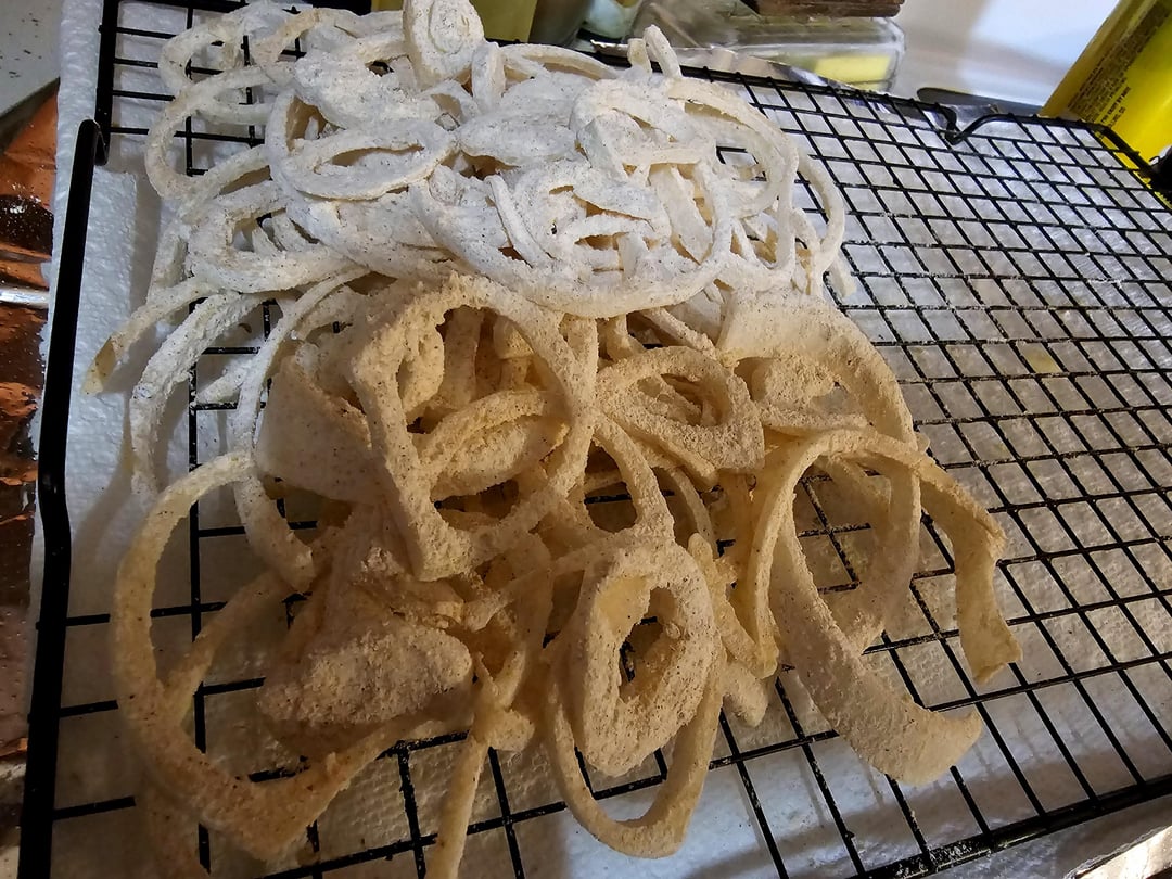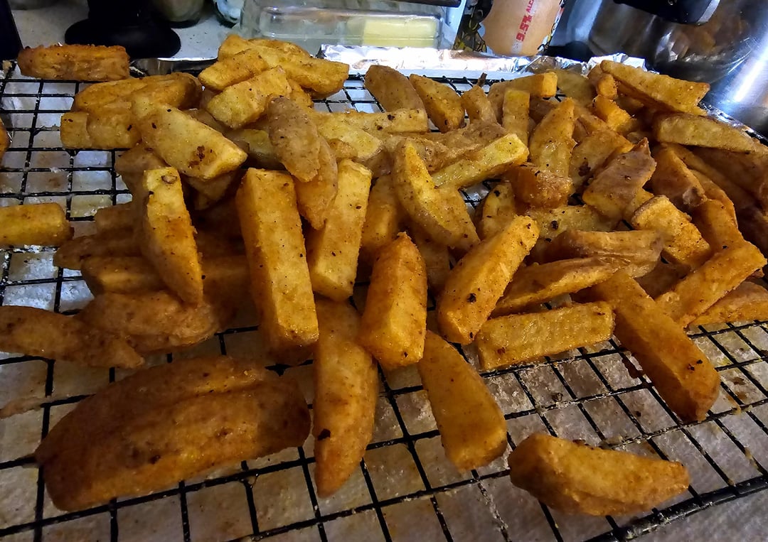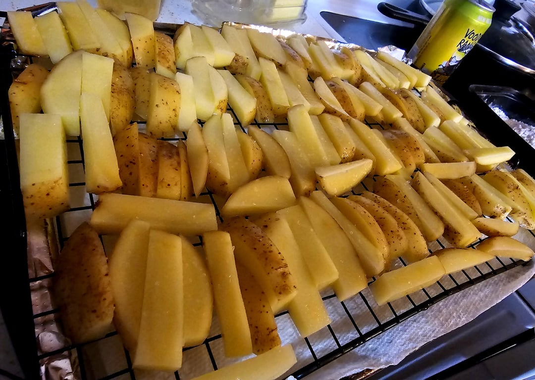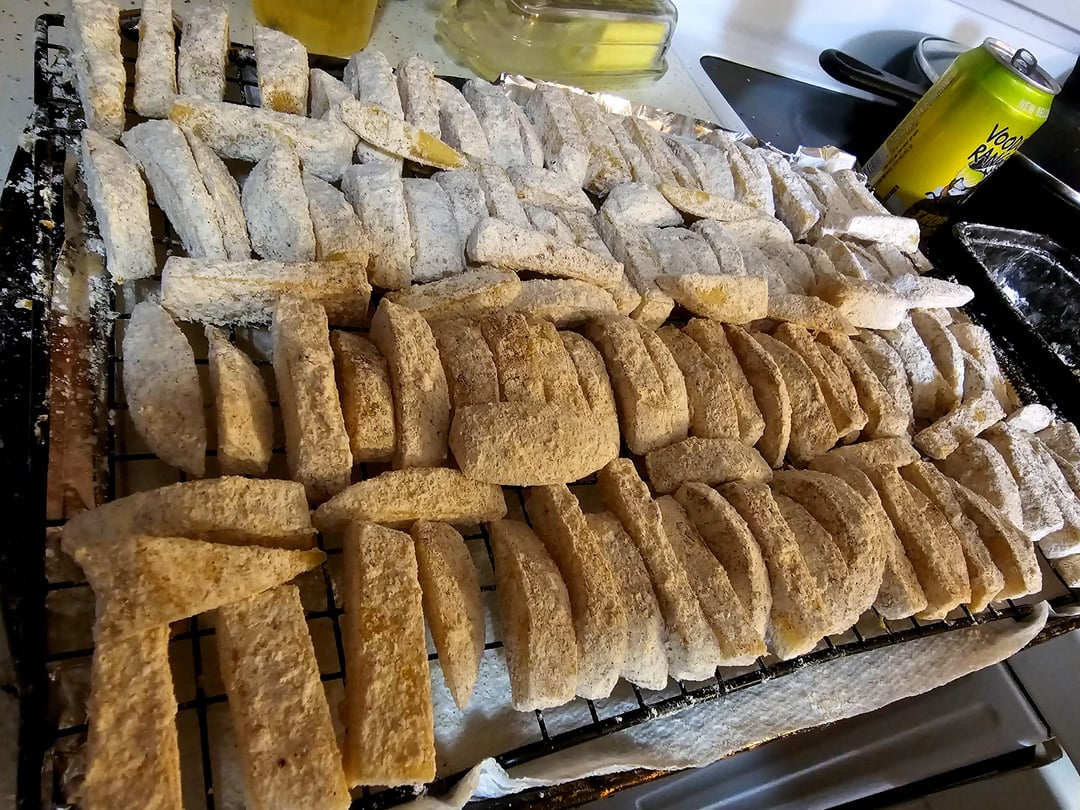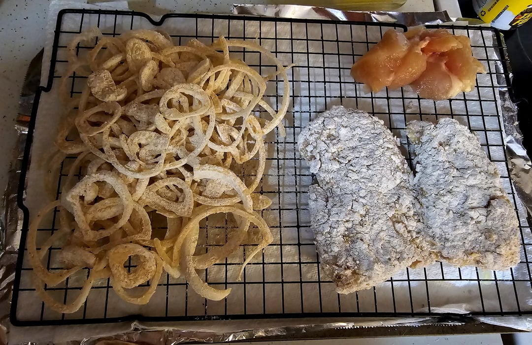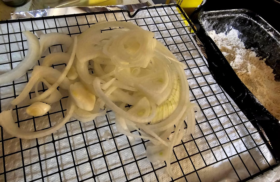 Prep the fries by cutting potatoes, rinse, then soak in the fridge overnight. Drain and coat with flour seasoned with salt, pepper, paprika, onion, and garlic. Thinly slice an onion and also coat with flour.