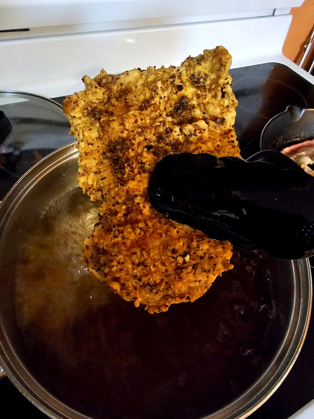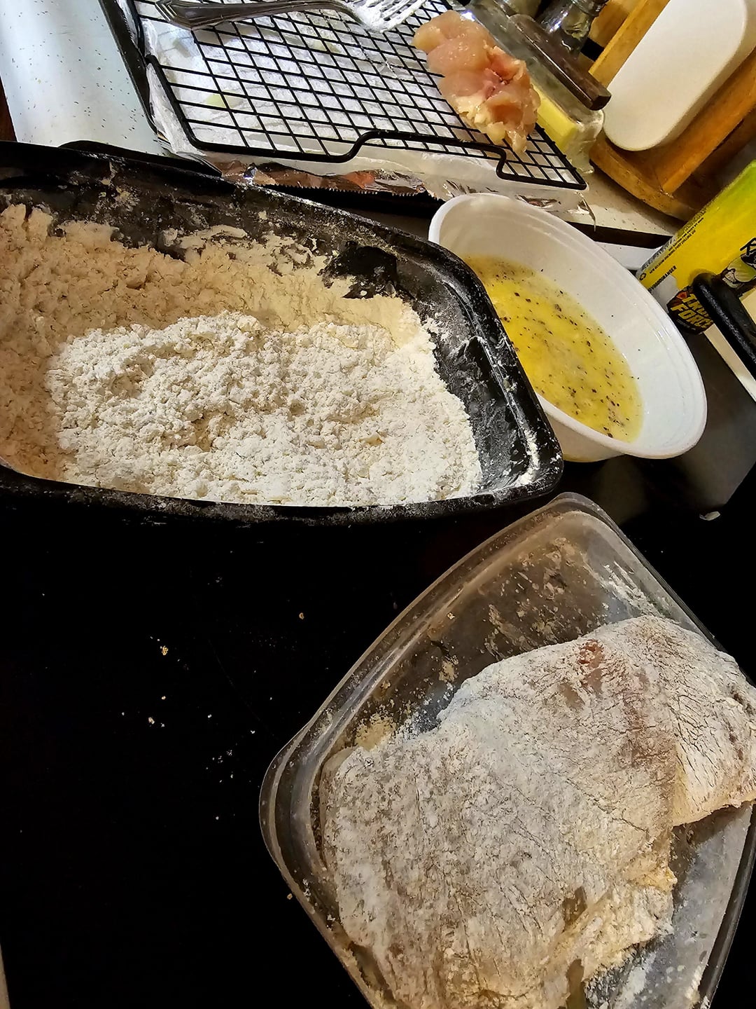 Scramble and season eggs the same as the flour then flour. Coat the chicken with flour then mix a little egg into the flour mix until it gets a little chunky, then egg and flour the chicken. Don't forget to save some plain chicken for dog treats 😆