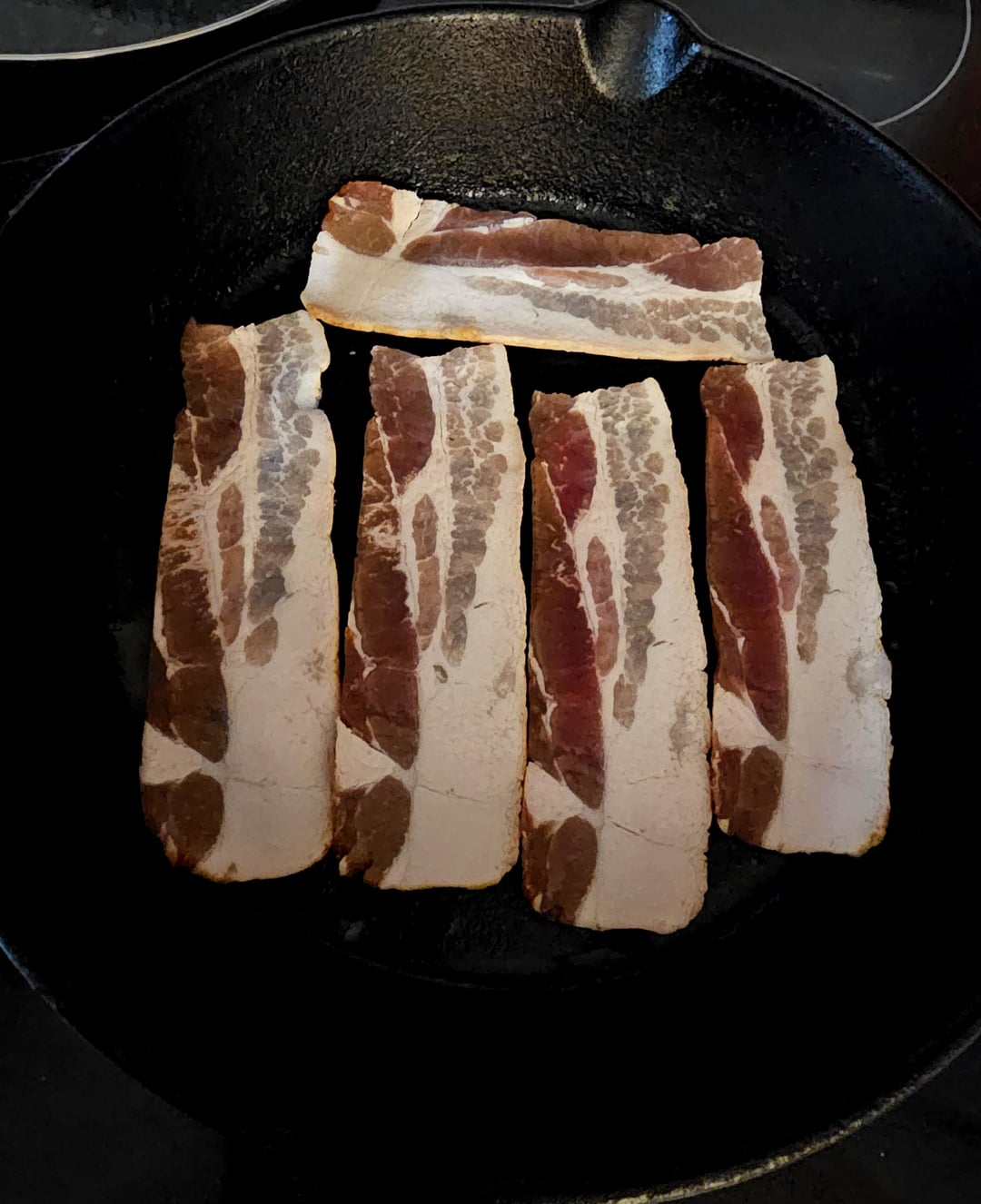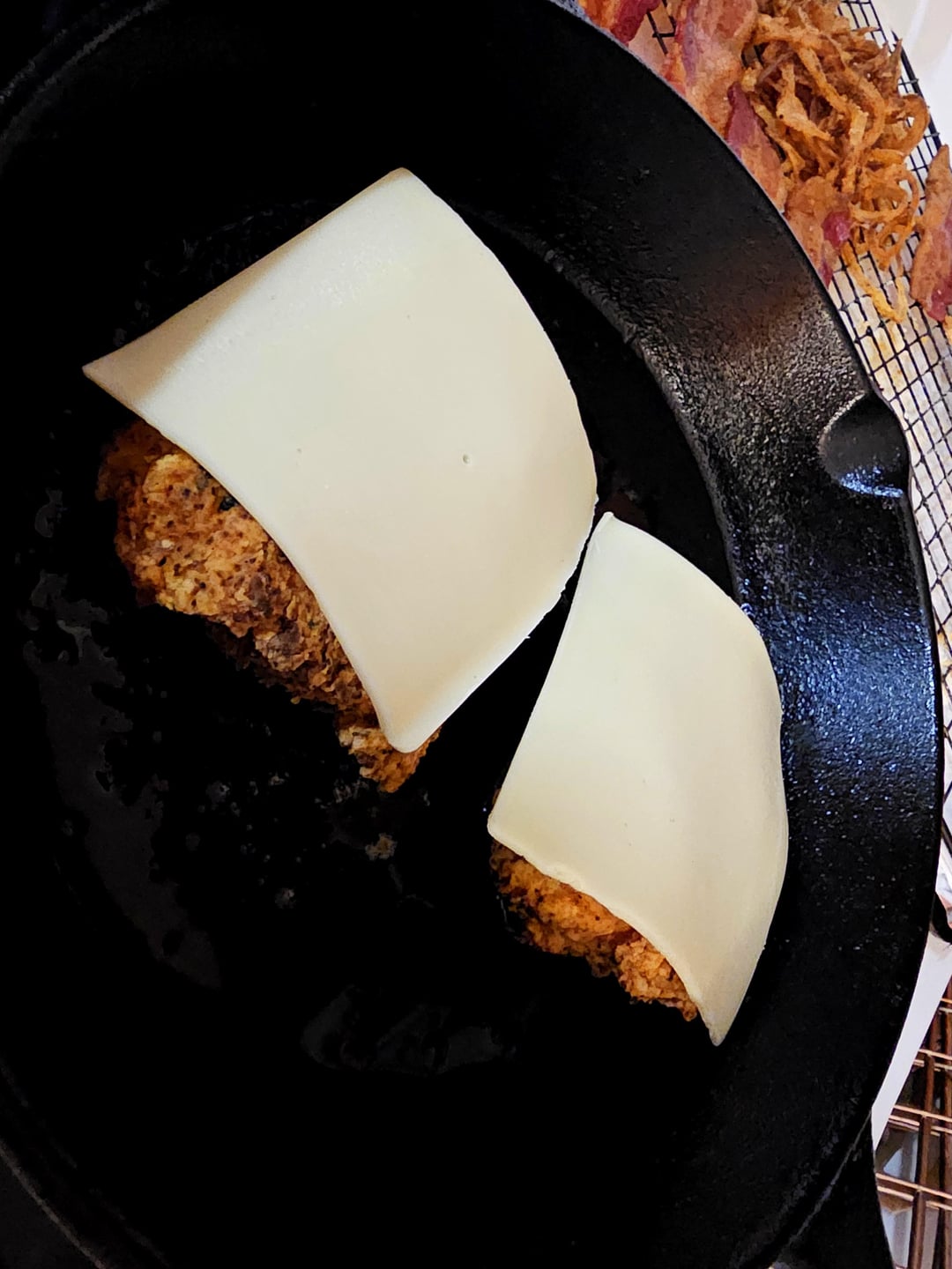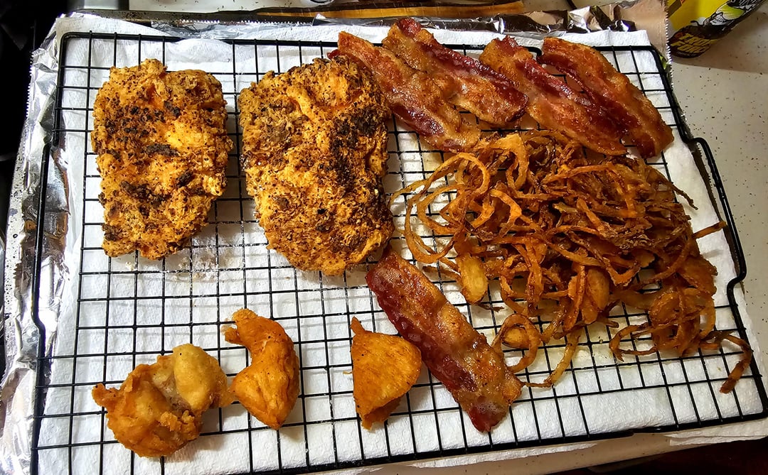 Start cooking some bacon and heating oil. Fry the chicken, fries, and onions, then set on a rack to drain any excess oil.