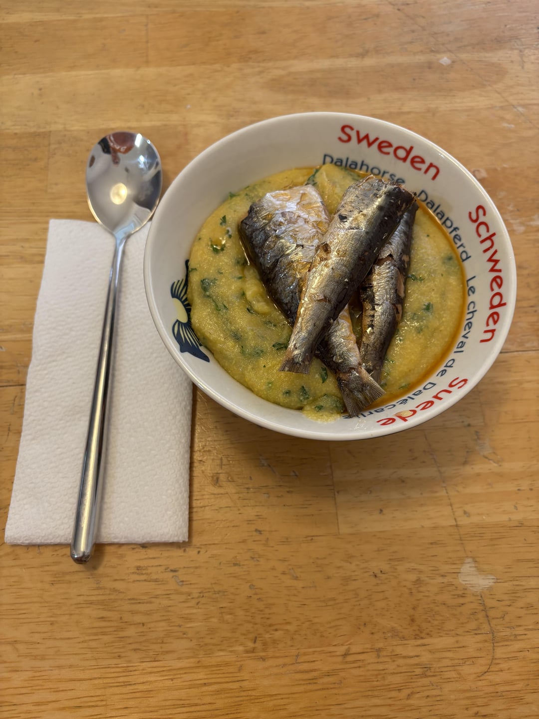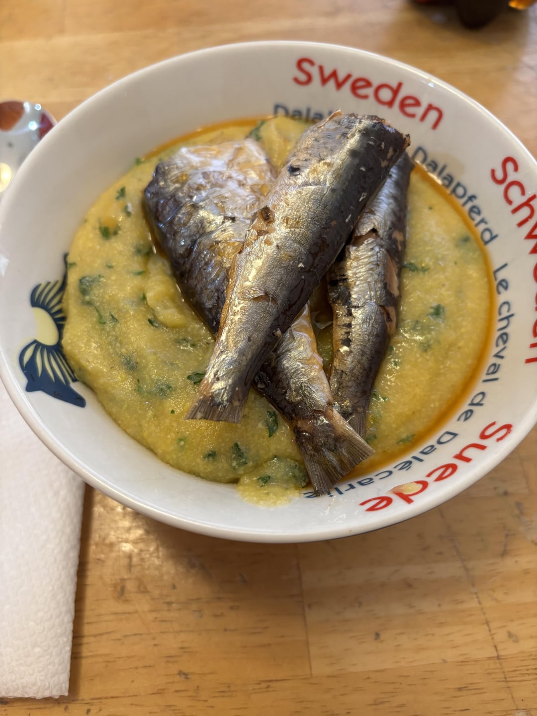 It’s cold, and I was looking for something for lunch that was comforting and warming, and that I hadn’t made in a while. I was considering making lobster tin oil mashed potatoes as a base for these sardines, but I had to open the freezer for stock of butter. And there was the cornmeal – It’s like the gourmet French sardine angels started singing to me: POLENTAAAAAAAAAA!!!!!