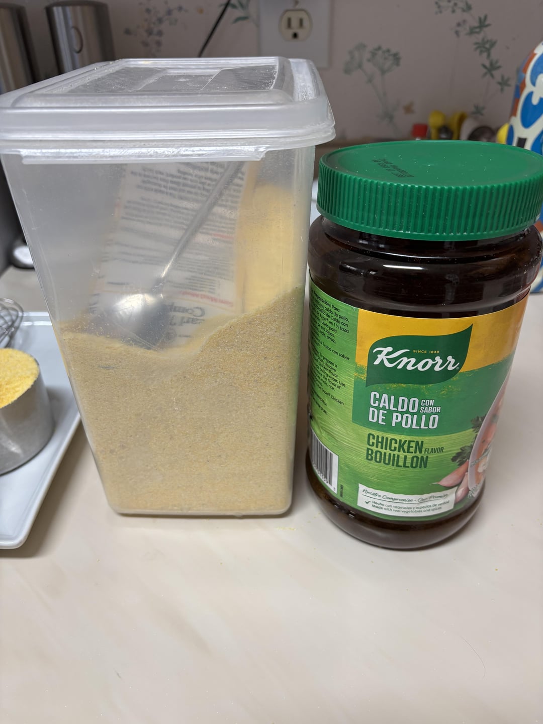 (6) Ingredients for polenta – I used regular corn meal because I wanted a finer grain, but any grind of corn meal can be used