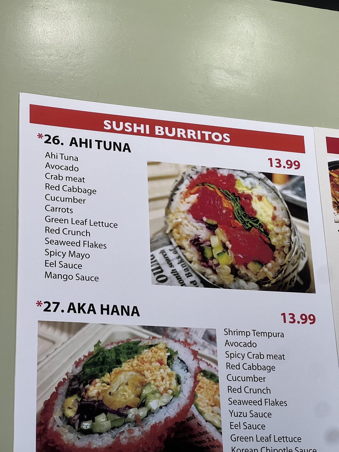 Make the locals with what they, sorta, Love: Burritos. The only thing I order here! Full, standard menu. #Arizona #Ahi #meal #crab #Kiyoshi
