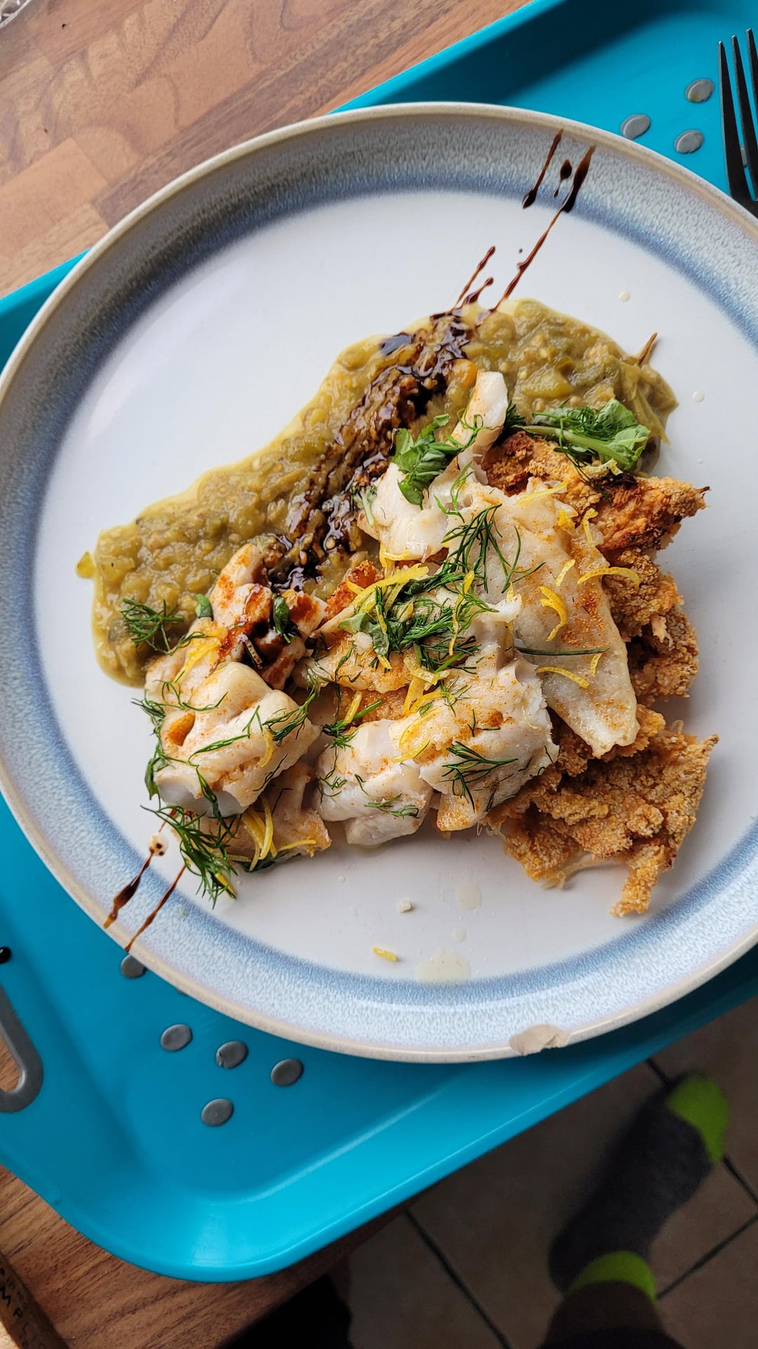 Pan fried cod, green tomato stew and an experimental quinoa and potato fritter ! Worked out pretty well. I still have a load of tomato based sauces in the freezer from this years crop. Maybe a nice warming soup nextby [deleted] Write A CommentYou must be logged in to post a comment.