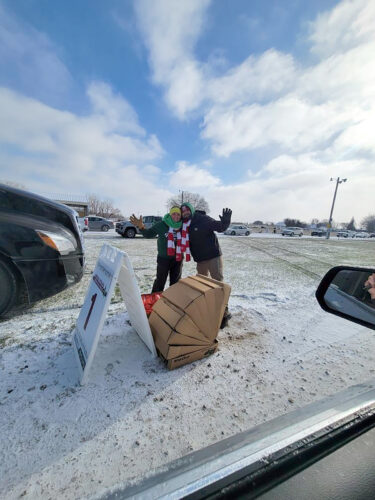 Volunteers give a cheerful wave at the giveaway at the Webster County Fairgrounds Wednesday.