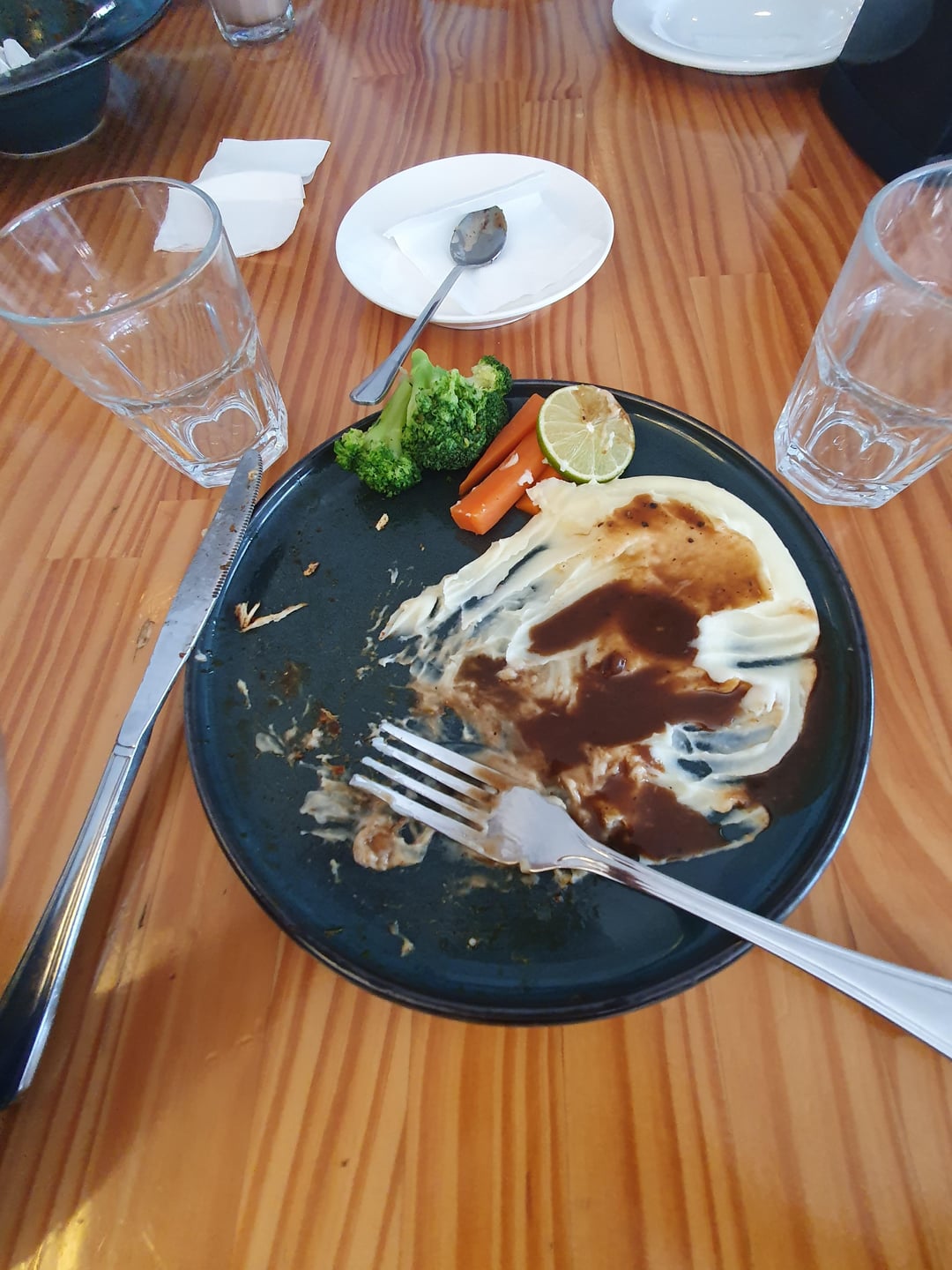 not sure how to accurately estimate this, the mashed potatoes portion size is quite large. didn't end up finishing the whole thing, second slide is how much I had left