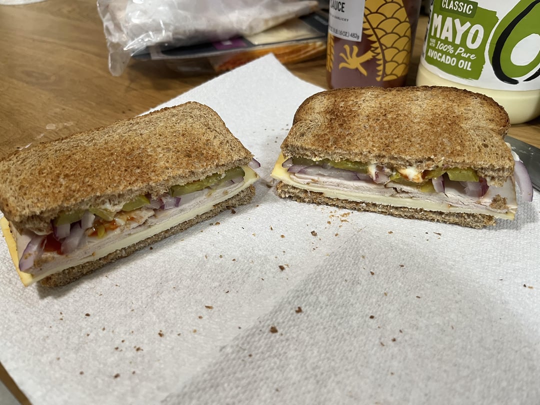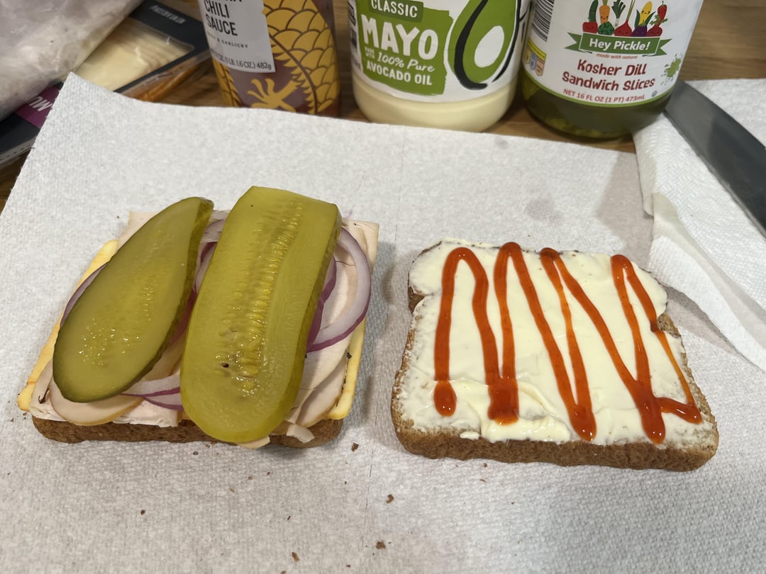 Made a fairly simple, but delicious sandwich today. Turkey, Muenster, red onion, pickles, mayo, and sriracha.