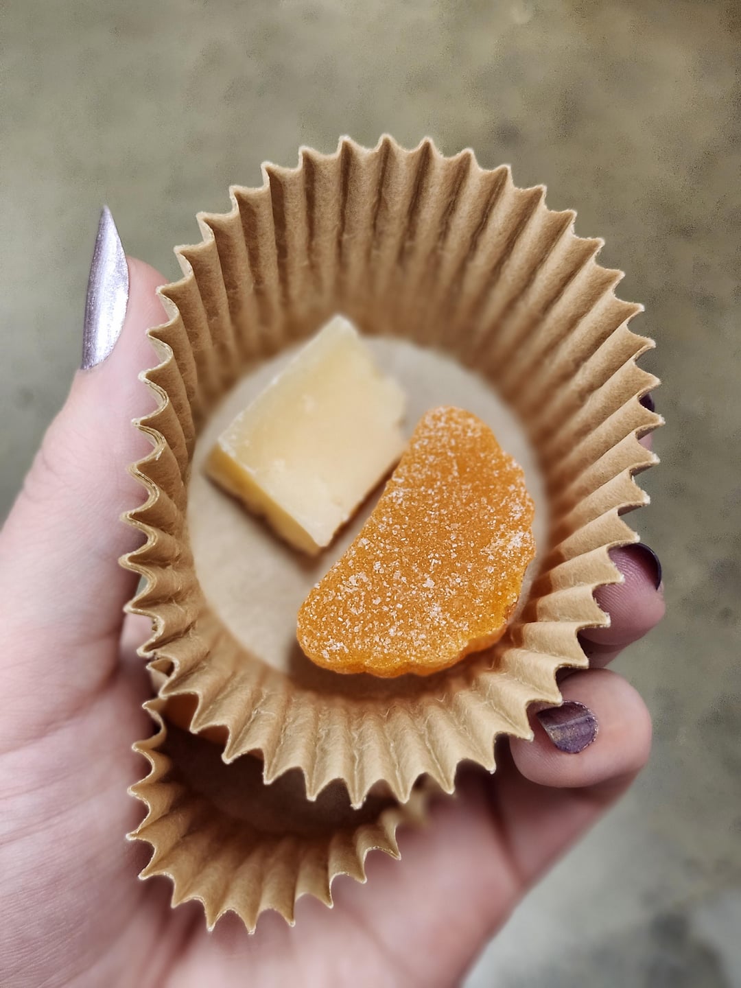 seasonal fall pairing. Gummy orange slices and parmesan cheese. They also were gonna do a pumkin spice cheese and heath bar one later that day. The poor employee was so apologetic but provided the best customer service with a smile and amazing attitude🥰