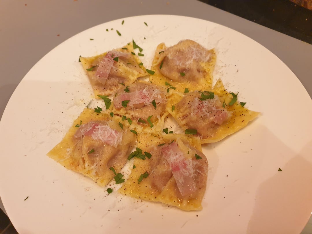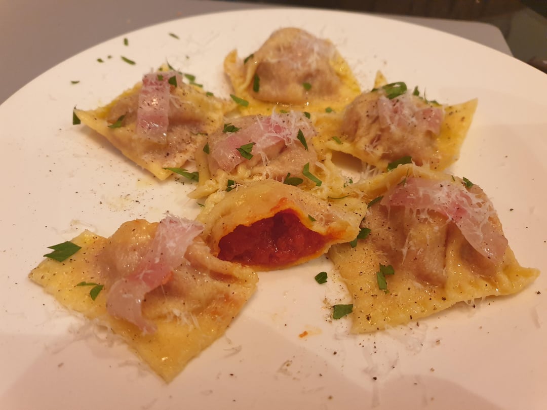 Ravioli all’Amatricianaby Ratchet3141 2 Comments Ratchet3141 10 months ago Pasta dough is 2 parts semolina, 1 part wheat. Only eggs and a pinch of salt, hand kneaded.Filling is standard all’Amatriciana (Parmigiano already added) plus a little bit of starch to keep it firm.Cooked, hot ravioli are quickly drizzled with olive oil and then plated with thinly sliced raw Guanciale and some Peccorino grated over it. hjperez2000 10 months ago Mmm… Molto interessante. Si vede buonissimaWrite A CommentYou must be logged in to post a comment.