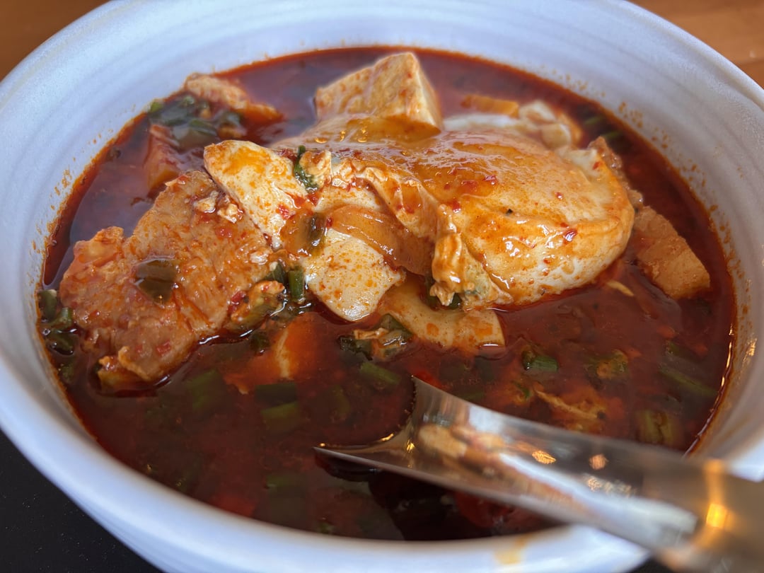 So I’ve got onion, green onion, 2 Thai chilli’s, a sweet potato, cabbage, kimchi, gochugaru, gochujang, sesame oil, chicken stock, pork belly, the soft tofu, and an egg.