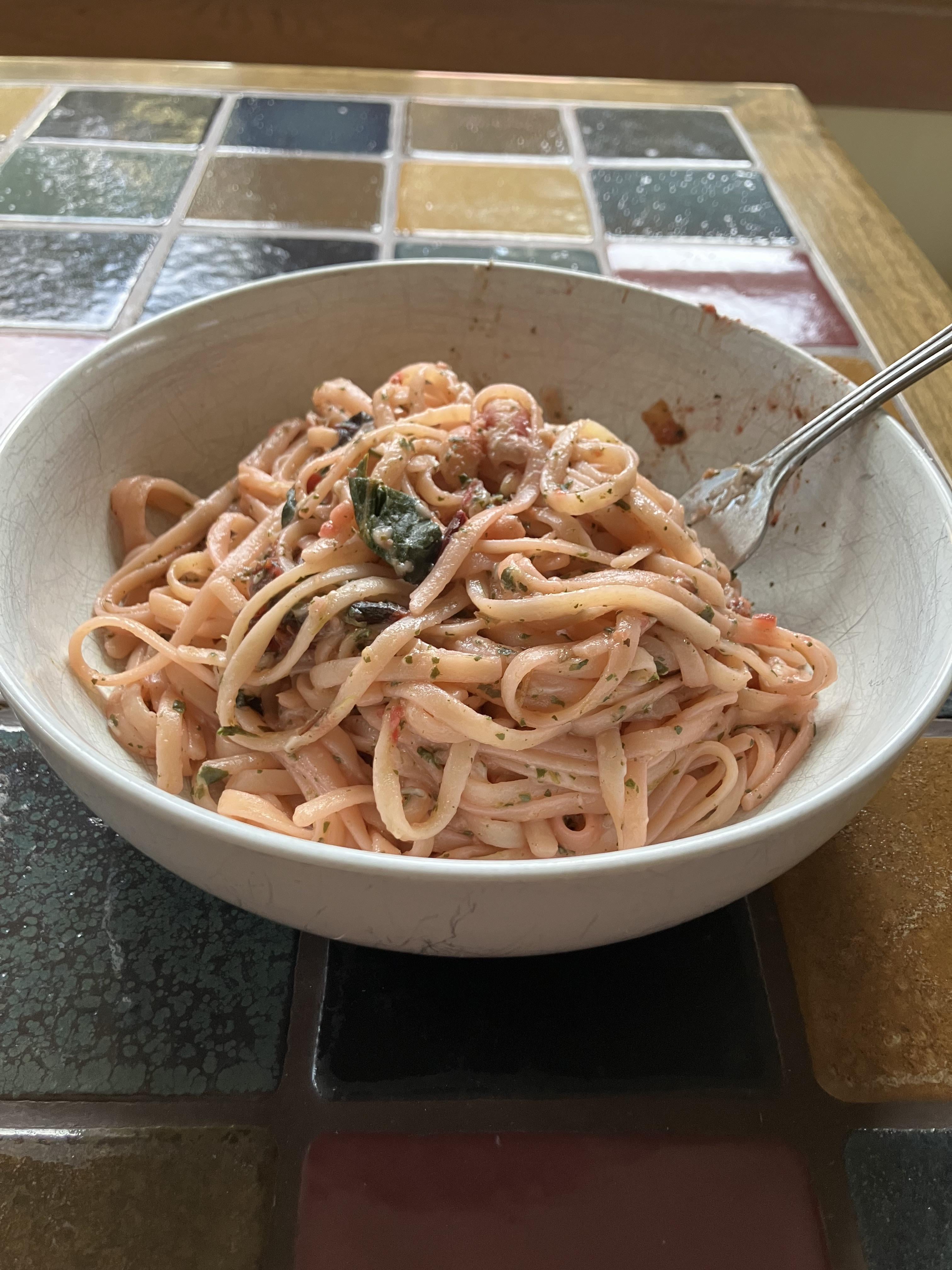 Sautéed up some beet greens with onions and garlic, tossed in some white beans, blended about 80% of into a crema, and tossed it with pasta and pecorino romano. Che buona!by SniggleFax Write A CommentYou must be logged in to post a comment.