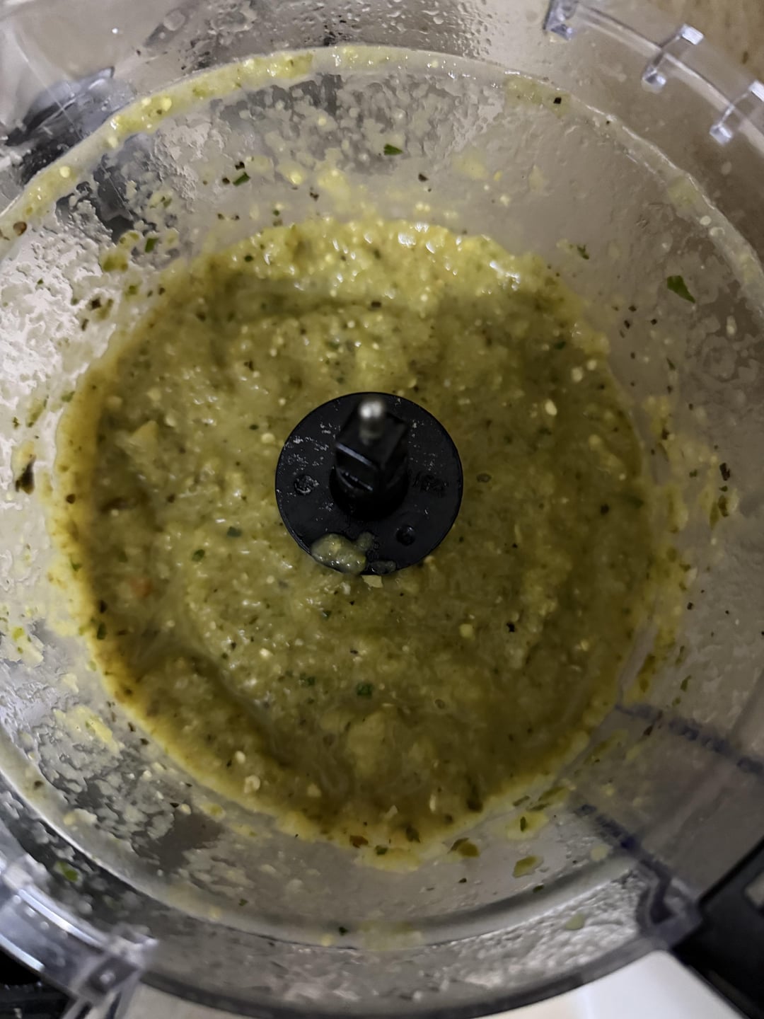 2 Tomatoes (I never used Them lol) 3 Jalapeño’s, 6 Tomatillos, 1 Large White Onion, 5 Serranos, 8 Garlic Cloves (It wasn’t overpowering because most of the pieces were small) Lime Juice, Salt, Cilantro, Water. The flavor was great! I thought it needed kore heat, so I roasted and tossed in 2 Habaneros that I purchased prior to making but wasn’t sure of I needed them. Overall again it’s got great flavor, but I’d like it to be spicier Personally