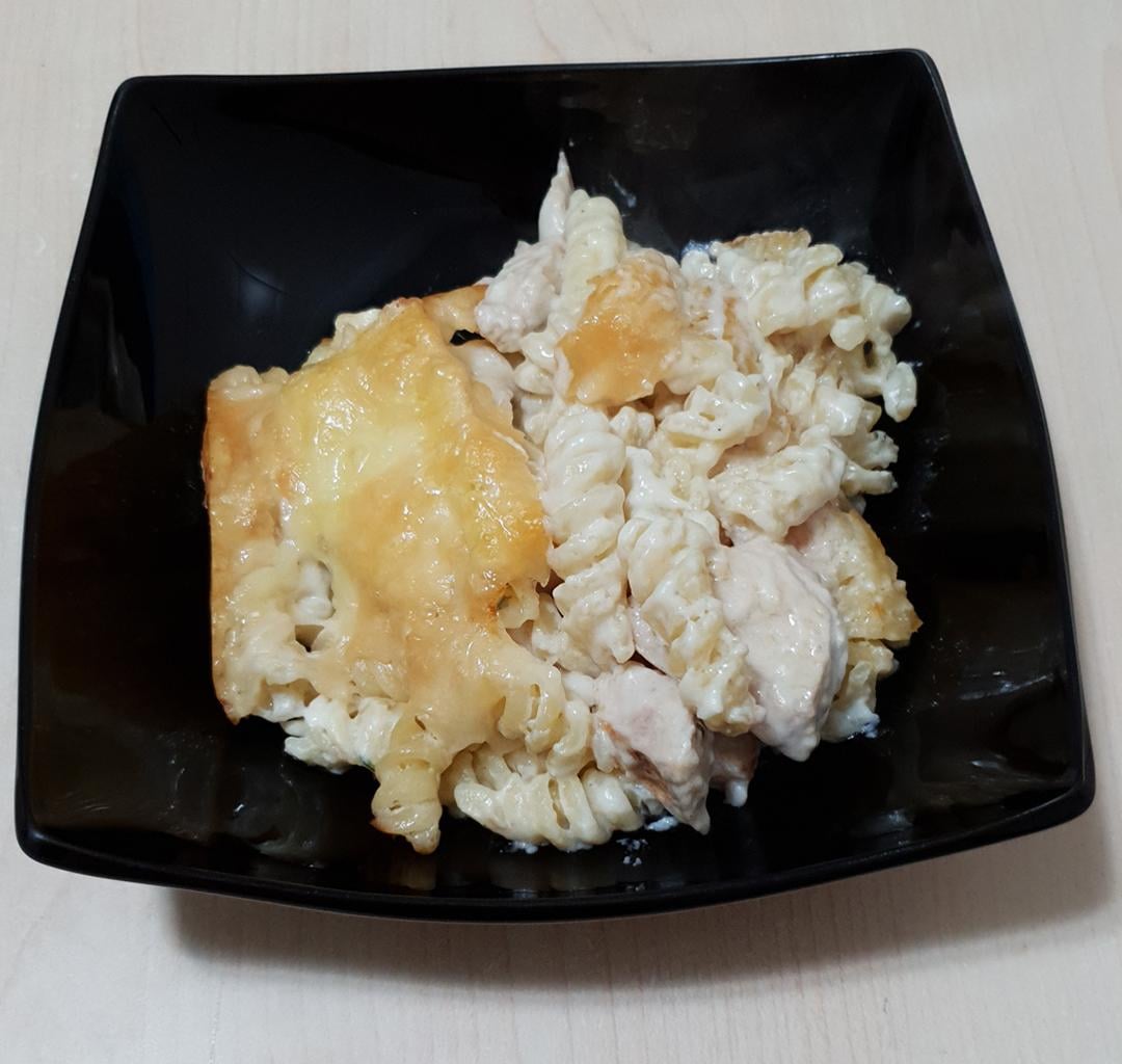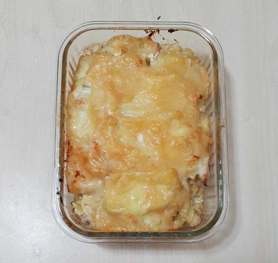 Chicken and pasta casserole with bechamel, Brie and Grana Padano