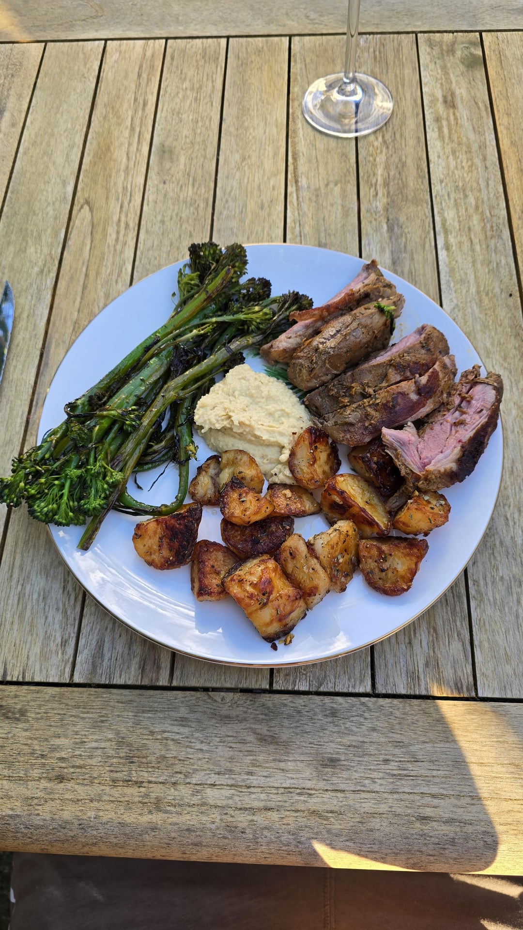 Butterflied leg of lamb which I rubbed with a Moroccan rosemary spiced and used hot mustard as a binding agent. Crispy roasted garlic and rosemary potatoes, homemade hummus and roasted broccolini.
