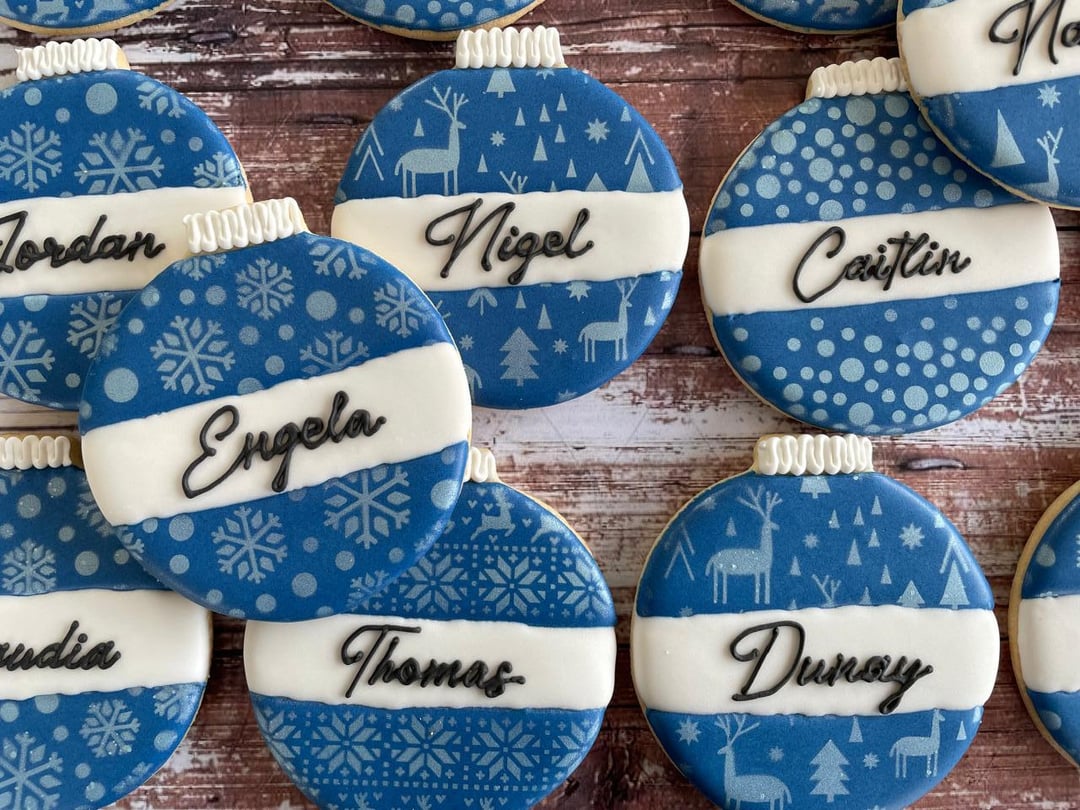 Matched the client's blue shade and then airbrushed in silver with 4 different designs. Used my projector and the Authentica font for the names.