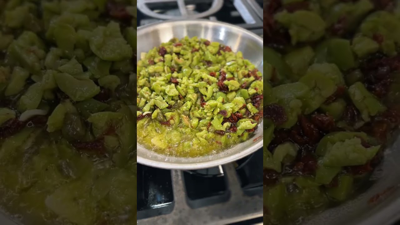 1. In a medium fry pan toast garlic in sun-dried tomato oil. Add olives, sun-dried tomatoes and capers. Deglaze with Moscato d’Asti and finish with torn basil.