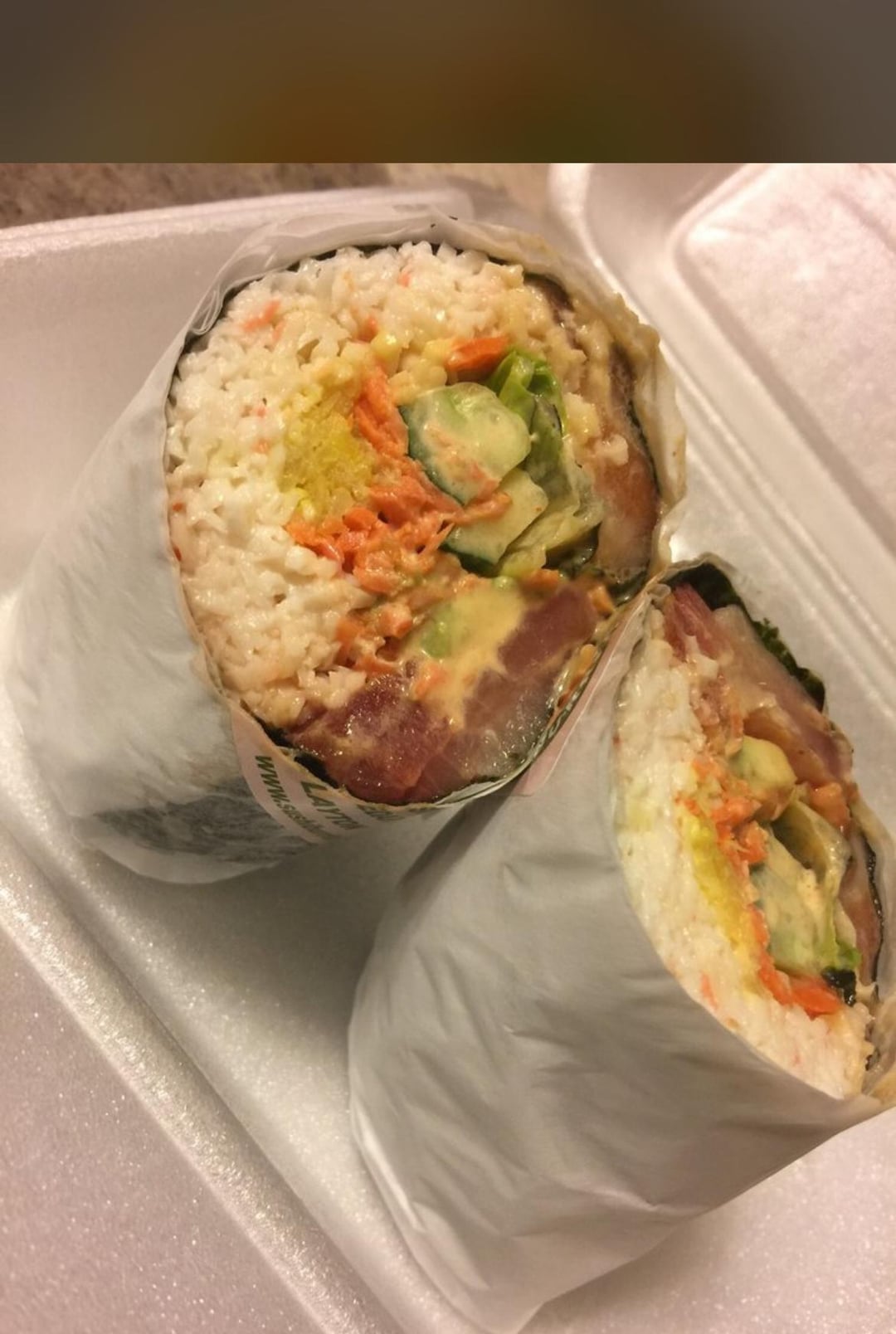 Calories in this rice-less sushi burrito? It has raw tuna, salmon, yellowtail, crab salad, lettuce, cucumber, avocado, pickled daikon and carrot. No sauce.
