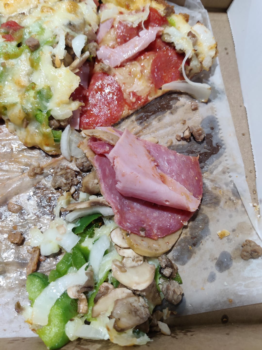 The goal is this: your first bite will complete destroy and deconstruct the pizza. You'll chomp through the cheese melted layer of peppers, onions and mushrooms but will inevitably get stuck on the semi warm cold cuts. Pulling your hand away will cause the cold cuts to slide off the pizza all the way from your mouth to the crust…. Taking the cheese melted layer on top with it. In your hand you have a pepperoni pizza, in your mouth you have full slices of ham and salami hanging off your chin, and on the table you have the melted cheese holding together the mushrooms, onions and peppers.