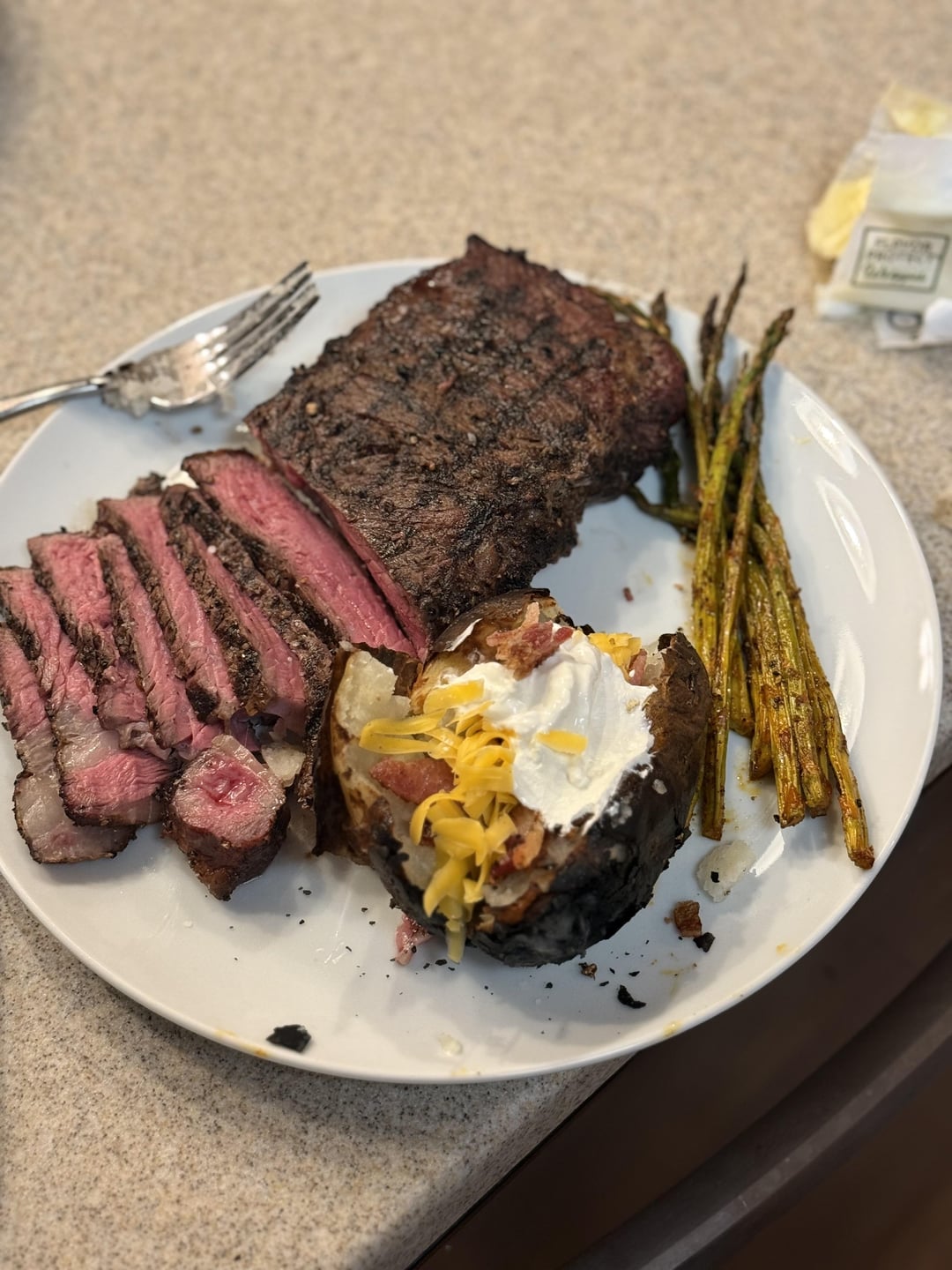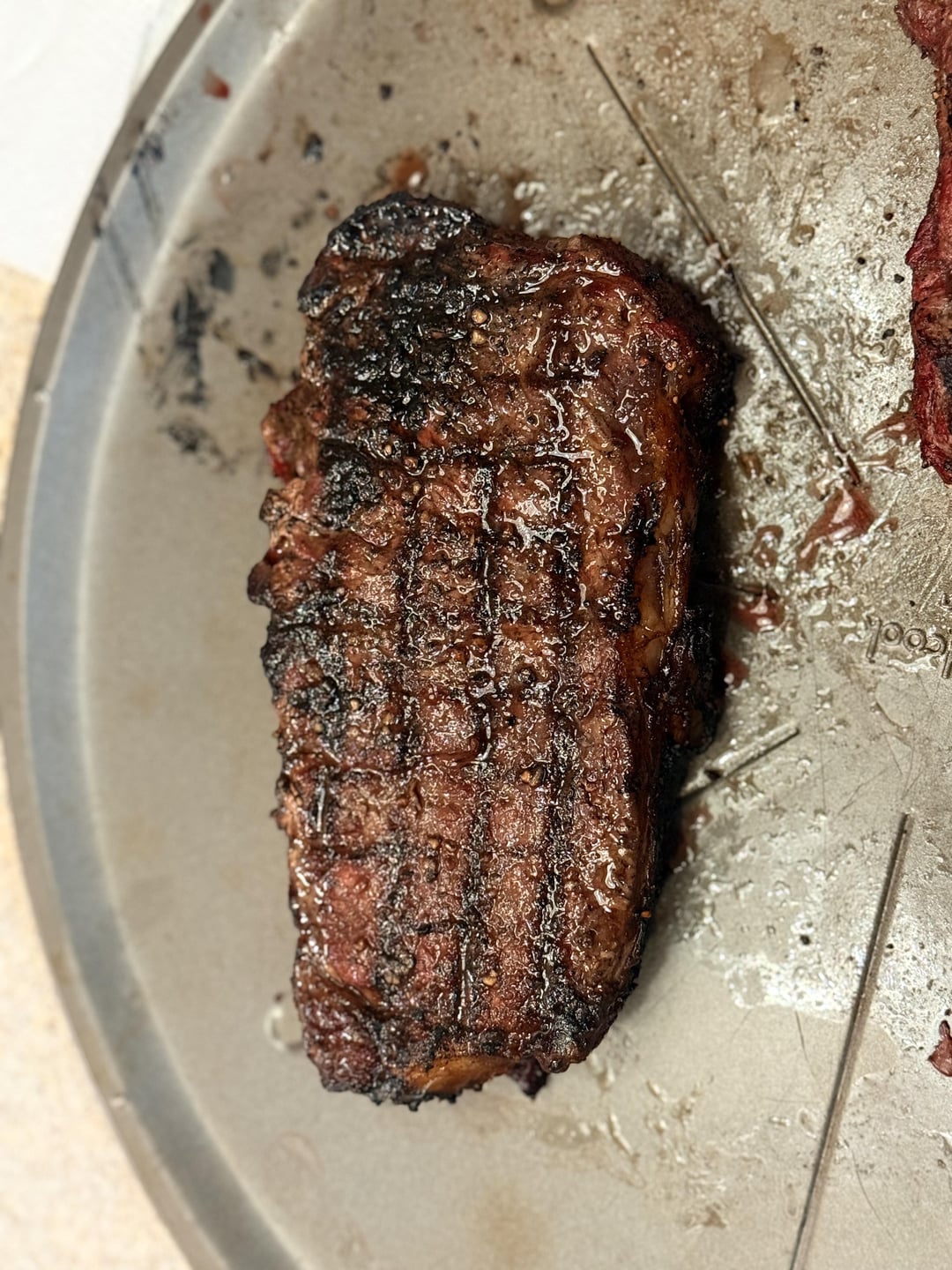 I smoked this using indirect heat at 225 until I got the steaks up to 120. I pulled them out and let them rest while I took off one of my indirect plates and let my grill get piping hot. 600 degrees. I used the reversible cast iron grate to see how the grill marks would turn out and for my first time using it I am very happy with the results. I baked the potato’s in the grill as well. Over cooked the skin a bit so next time I will try putting the potatoes in earlier so I can cook them at a lower temperature and take them off before turning up the heat!