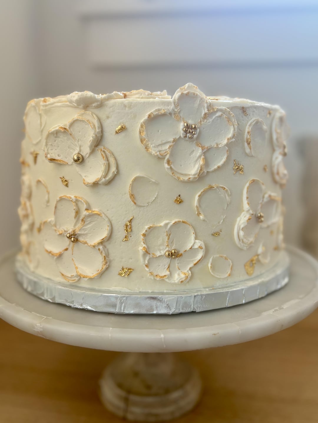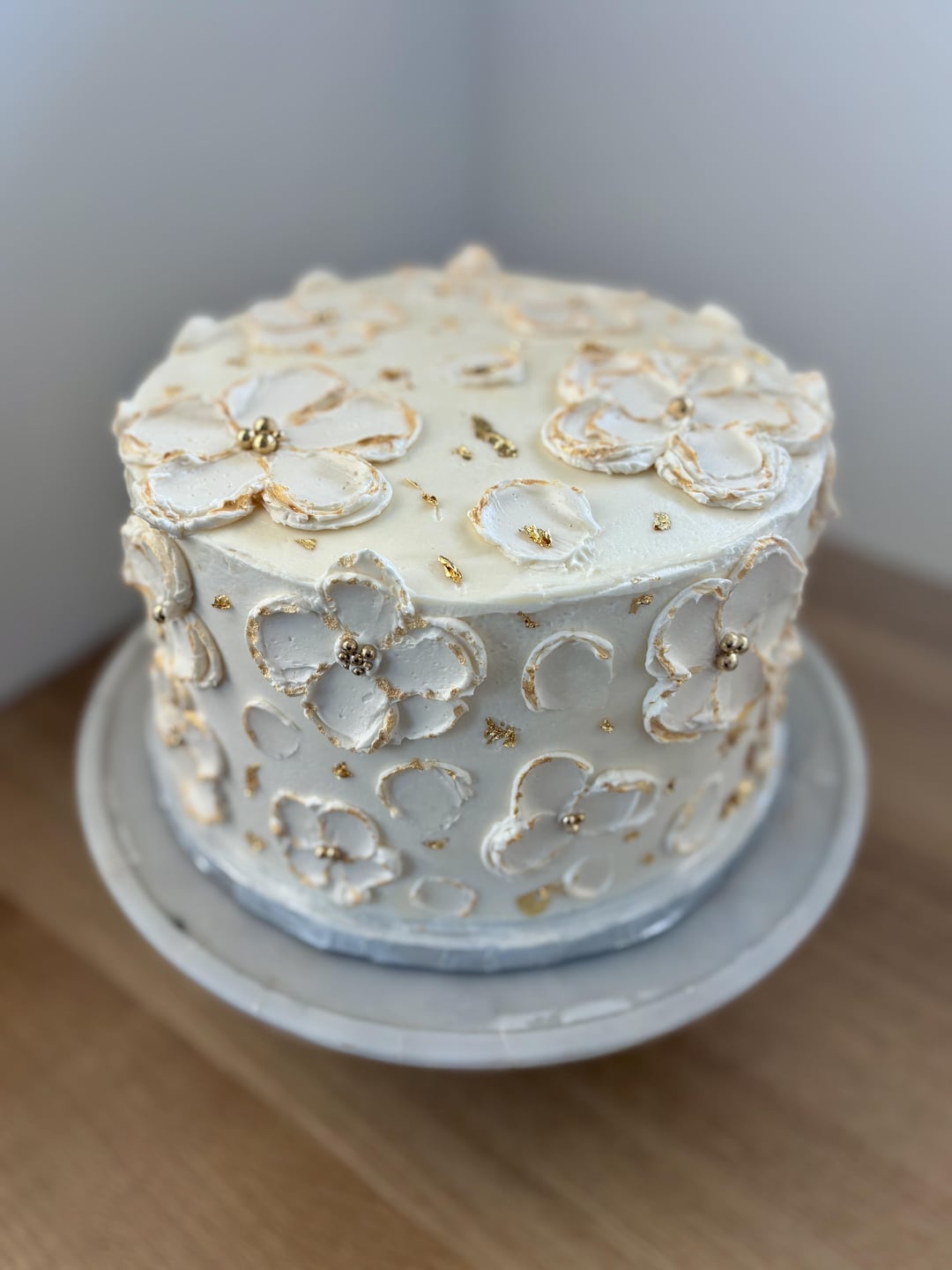 She wanted it white and gold – it’s a birthday cake that looks a little like a wedding cake but I’m pretty proud of it! And omg gold leaf is hard to work with they make it look so much easier on baking shows! 😅