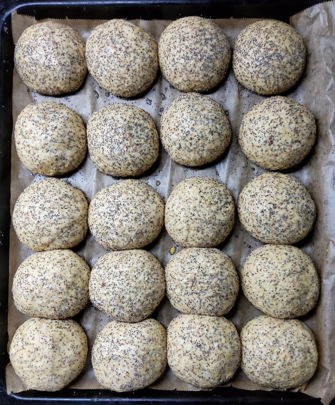Brushed with egg/milk wash, sprinkled with poppy seeds.