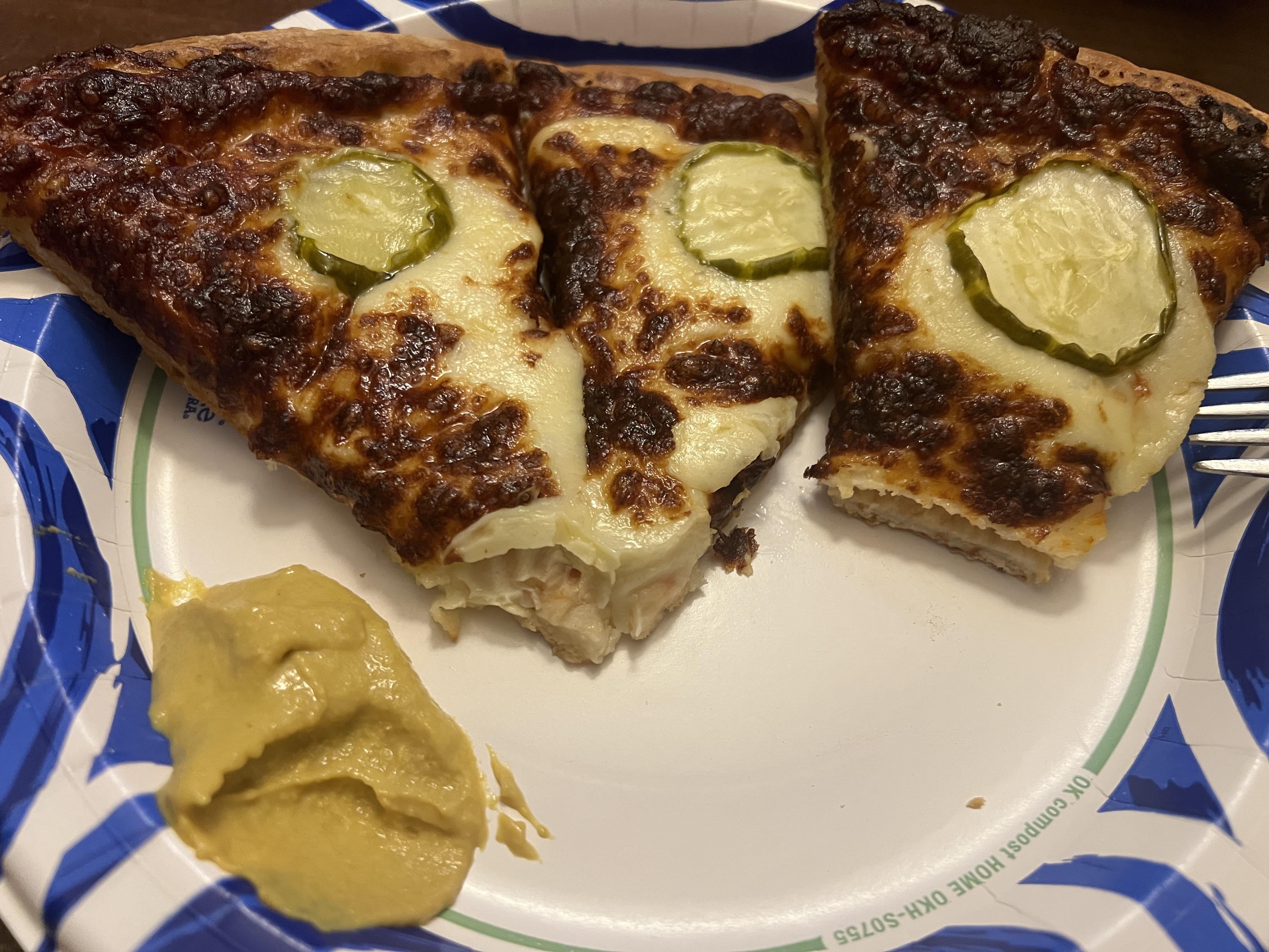 The burnt cheese is the worst thing here. Pickle and mustard by itself is strange, I’ve had something similar that also had red onion and diced beefburger and it was really nice but by itself the pickle & mustard might not work as well. It’s a pizza misdemeanor at worst.