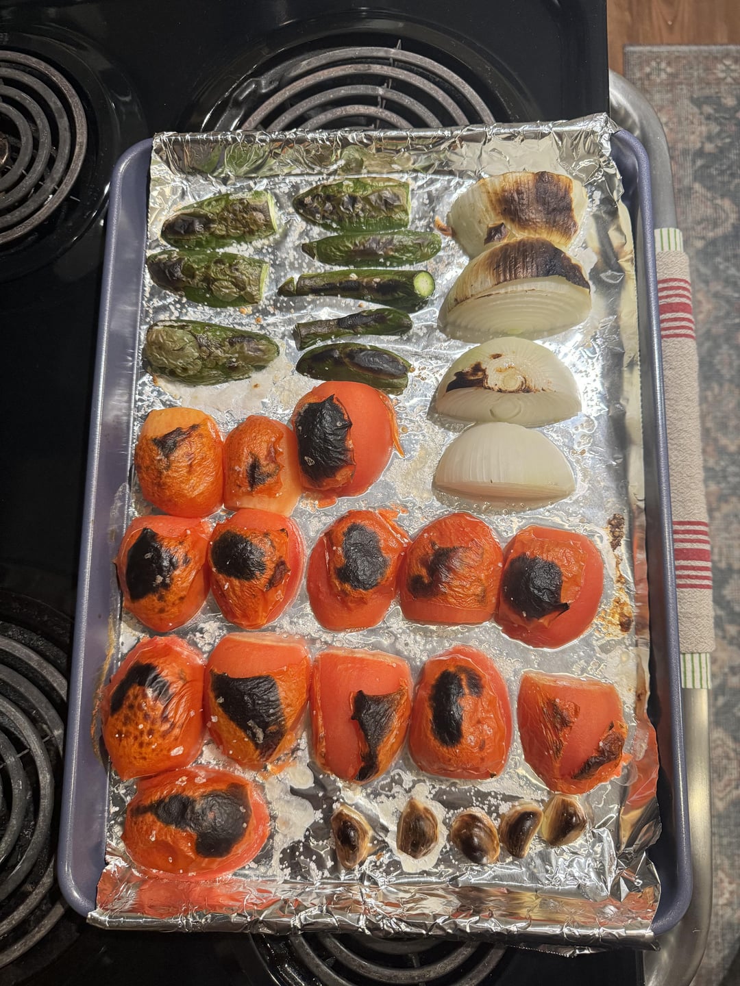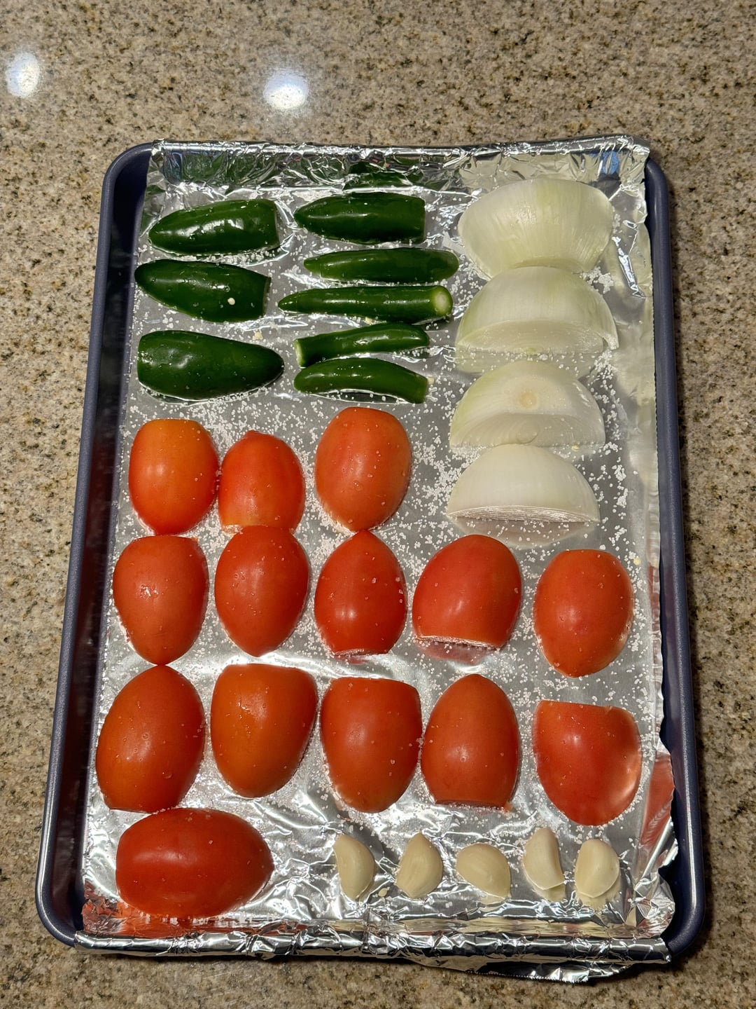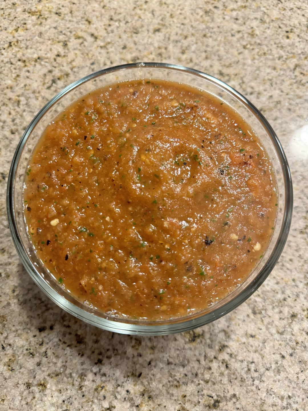 speedy841 10 months ago Recipe –~2 lbs Roma tomatoes, sliced in half 5 garlic cloves 2 jalepenos, sliced in half 3/4 white onion, quarteredAdd coarse salt then broil on high, 10 – 12 minutesPulse blend until desired consistency with: A lil cumin A lil chicken bouillon A lil salt 1 lime Handful of cilantroNote: There are seranos in the pic since I was going to test it but 2 jalepenos were perfect for what I wanted.