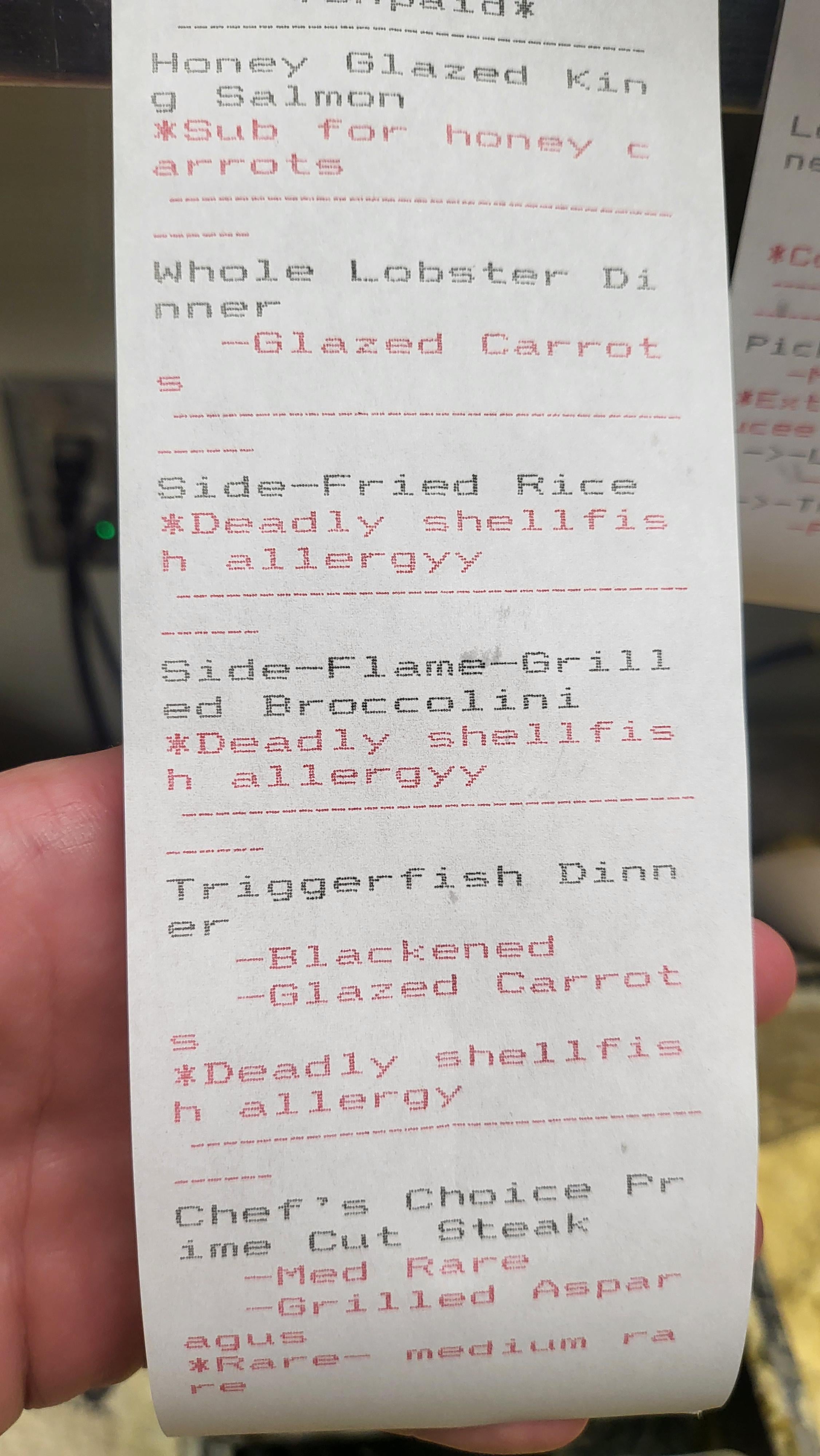 i’m used to seeing seat numbers and indentations for temperatures and sides. the way this ticket reads is just a nearly unbroken sprawl lol.