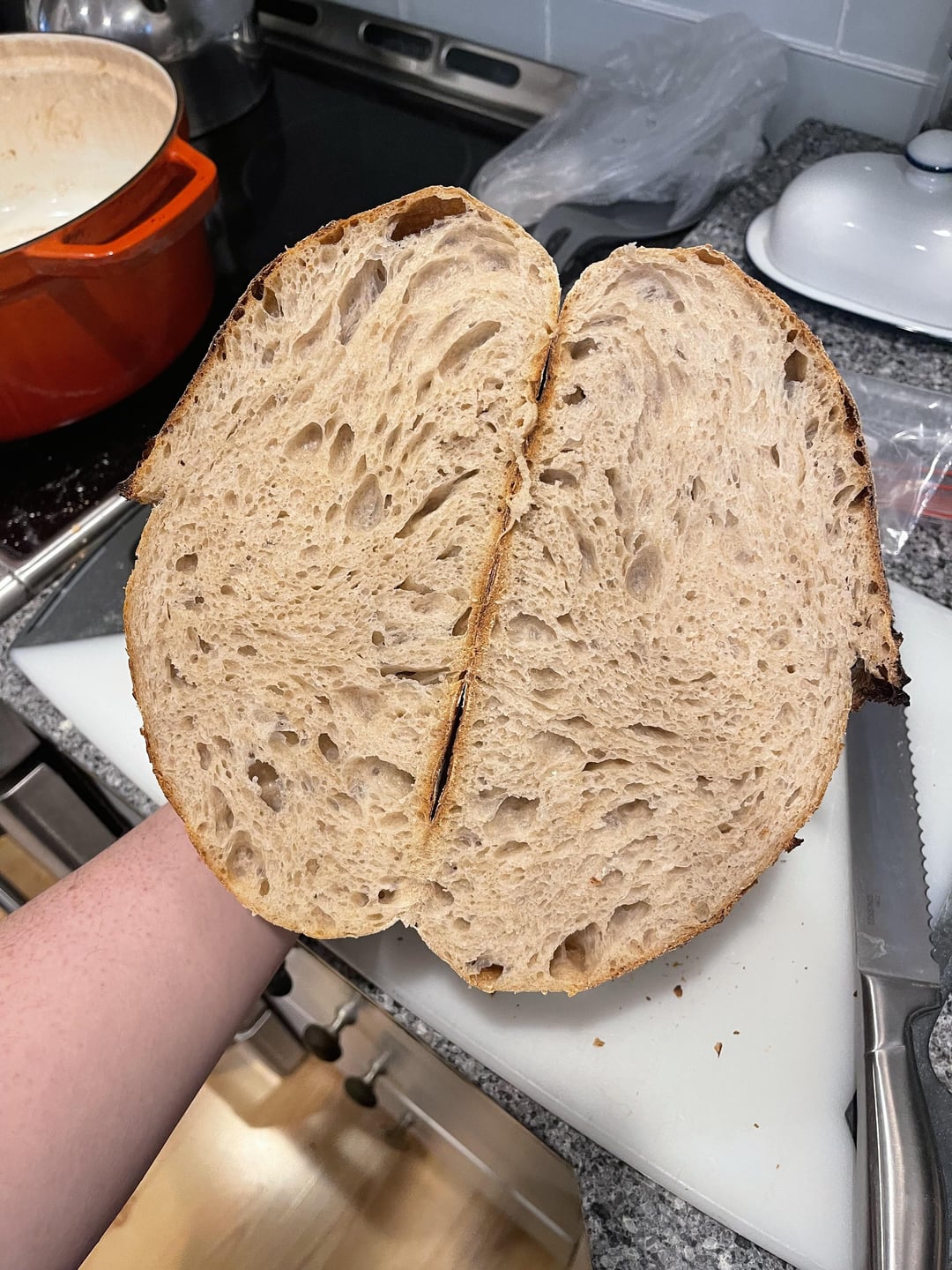 I am so happy with my crumb structure and ear this time around and just wanted to share with you all here! I have been rising Hailee Catalano’s recipe, linked above – but experimenting with different folds. Here, a combination of coil folds and stretch and folds were used. I feel like I’m really starting to get to know my dough with this recipe and am excited to keep experimenting and improving.