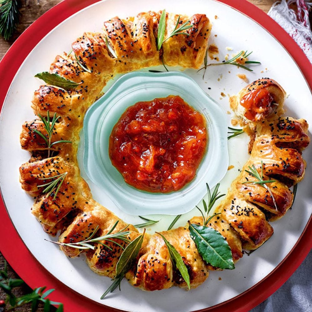 Sure, you can plonk sausage rolls on a platter and they’ll get eaten (because… sausage rolls). But, making a sausage roll wreath, decorated with bay leaves and served with a tomato chutney, is an easy way of turning a Christmas party staple into the star of the buffet table.
