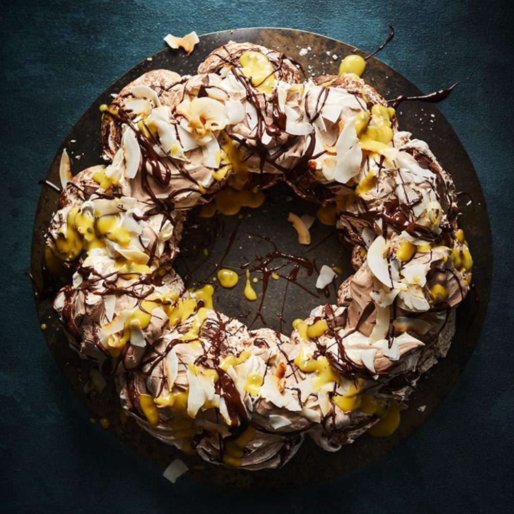 We’ve decorated this chocolate wreath with the tropical flavours of coconut and passion fruit. If you want to up the festive factor, you could try a blood orange or clementine curd, or decorate with redcurrants or cranberries.