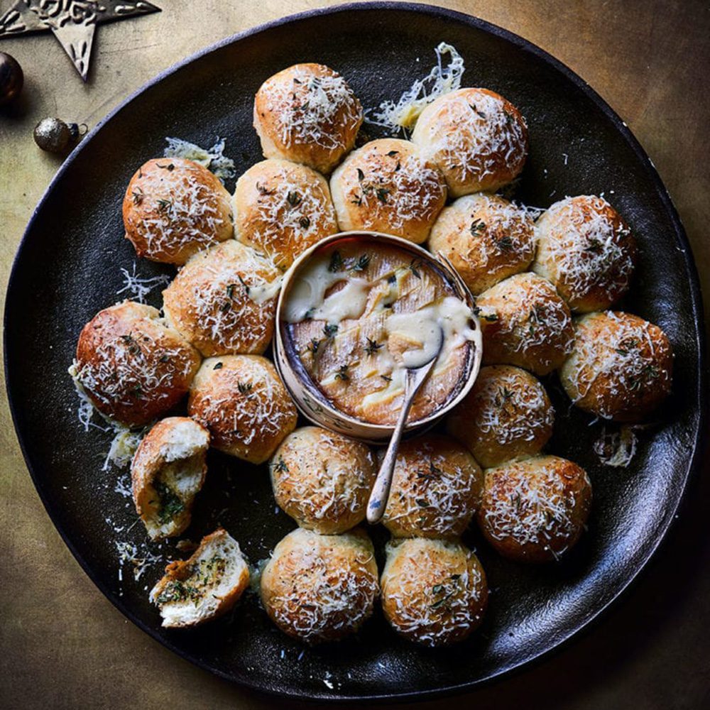 Take garlic bread to the next level with this wreath. Fill homemade gruyère doughballs with a garlicky walnut pesto, then arrange them around a camembert or vacherin cheese to form a wreath, and get ready to dunk…