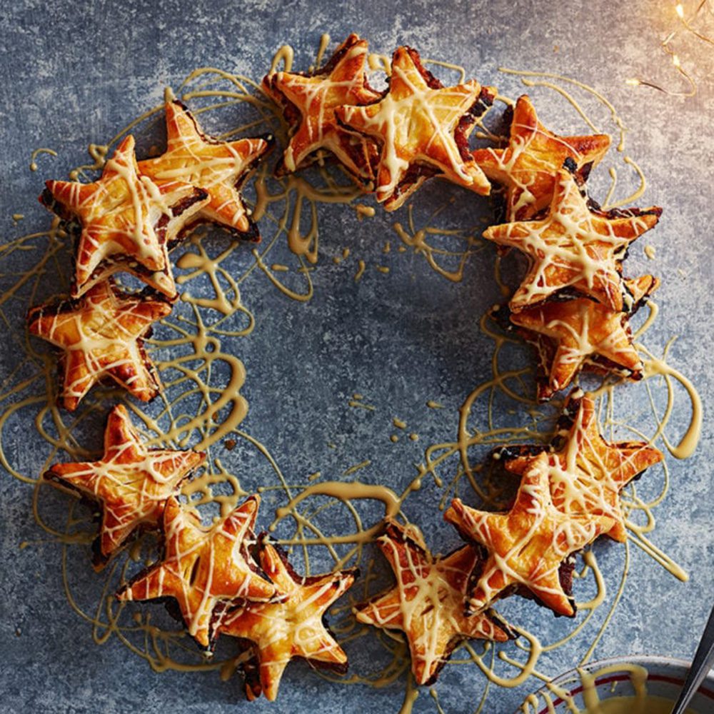 An easy take on an edible wreath is simply to place individual treats in a ring shape, like we’ve done with this eccles pie star wreath. A drizzle of white chocolate icing provides a simple but effective finishing touch.