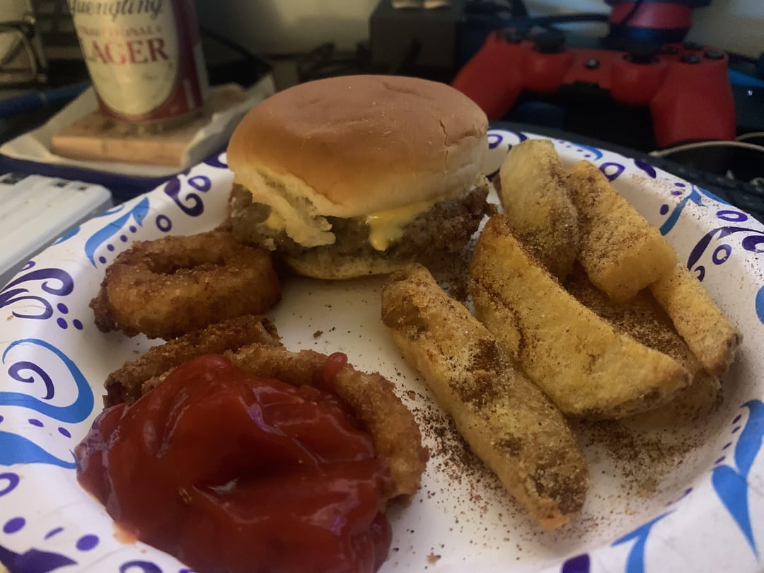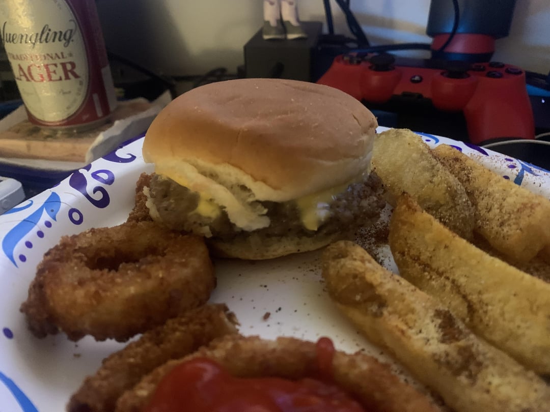 Late night munchies.. had enough ground beef for a copycat White Castle burger with leftover fries and onion ringsby Punch_Your_Facehole 4 Comments Macklemore_hair 10 months ago Love the Yuengling! Lager represent. Firm_Bed_3611 10 months ago Those ain’t fries those are logs or wedges(either way still awesome looking), and those onion rings look like they’re outstanding! Helpuswenoobs 10 months ago I was on board untill the third and fourth picture 😭 hamburgery 10 months ago That is a saturday meal. Thank u. 🍔Write A CommentYou must be logged in to post a comment.