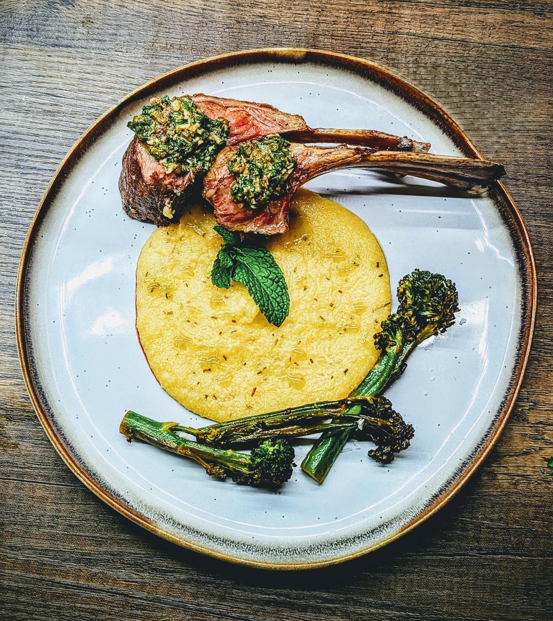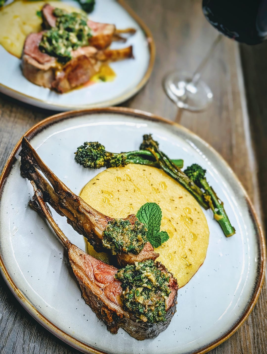 What’s the green “sauce”? I think I see garlic and lemon zest and mint garnish. Like a mint gremolata? I would add like a lamb jus or demi drizzle for some depth of flavor. Or you could switch up your polenta, I bet some feta cheese mixed in would match nicely. Or a bastardized tzatiki with some yogurt and cucumber. But it looks really nice other than not having enough broccolini which you know.