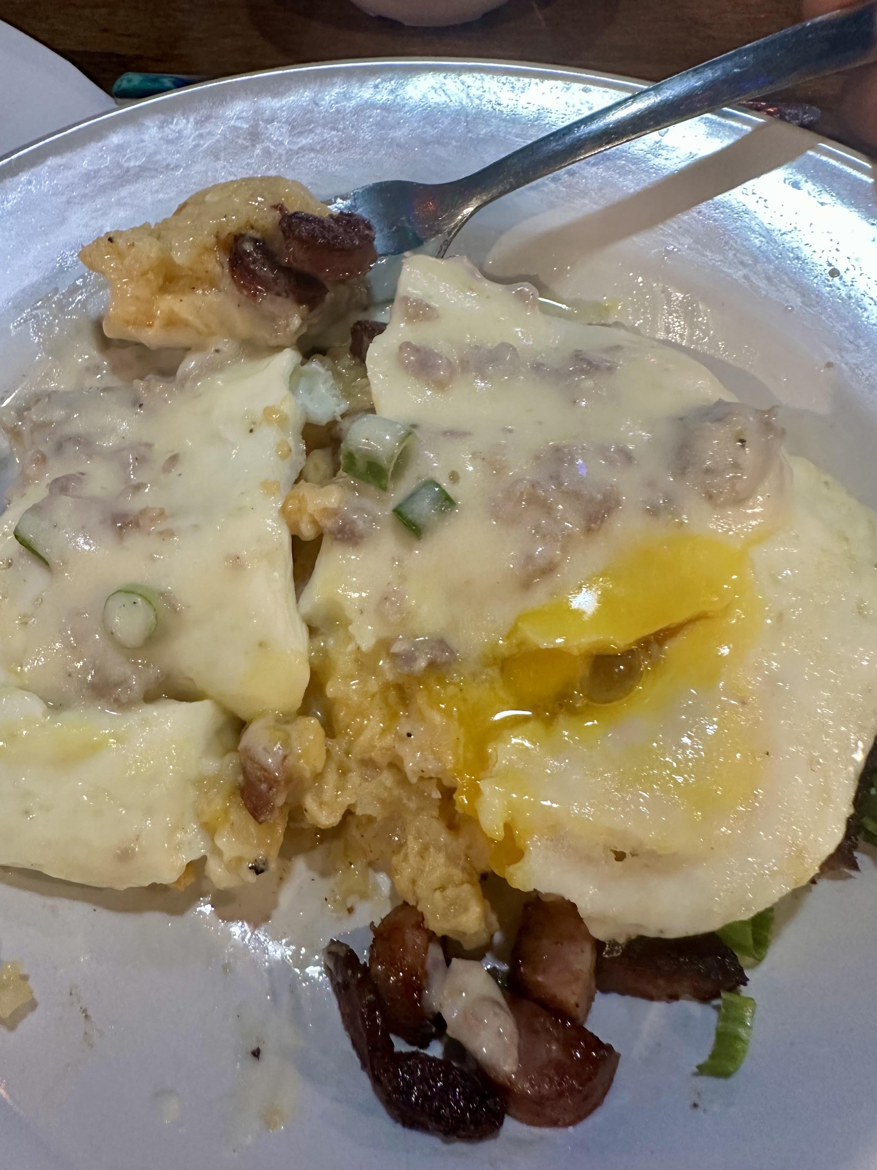 God bless the American South’s food. Breakfast bowl: I opted for hash brown casserole instead of grits, conecuh sausage (iykyk), sausage gravy and eggs over easy. Not pleasant on the eyes or arteries but delicious!