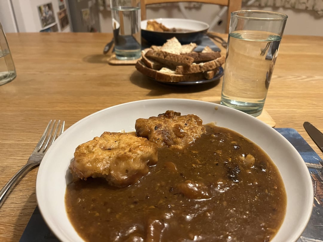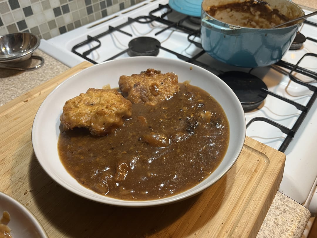 When it comes to serving, put the defrosted/partially frozen meal into a pot and fill with half a litre of stock. Gas mark 6 for 10 minutes. Now add gravy granules, a good stir. Itβll thicken in the oven. Add dumplings (50g suet, 100g self raising flour, salt, splash of water). Cook for half an hour, then remove lid and cook for another 15/20 minutes until the dumplings are crusty.