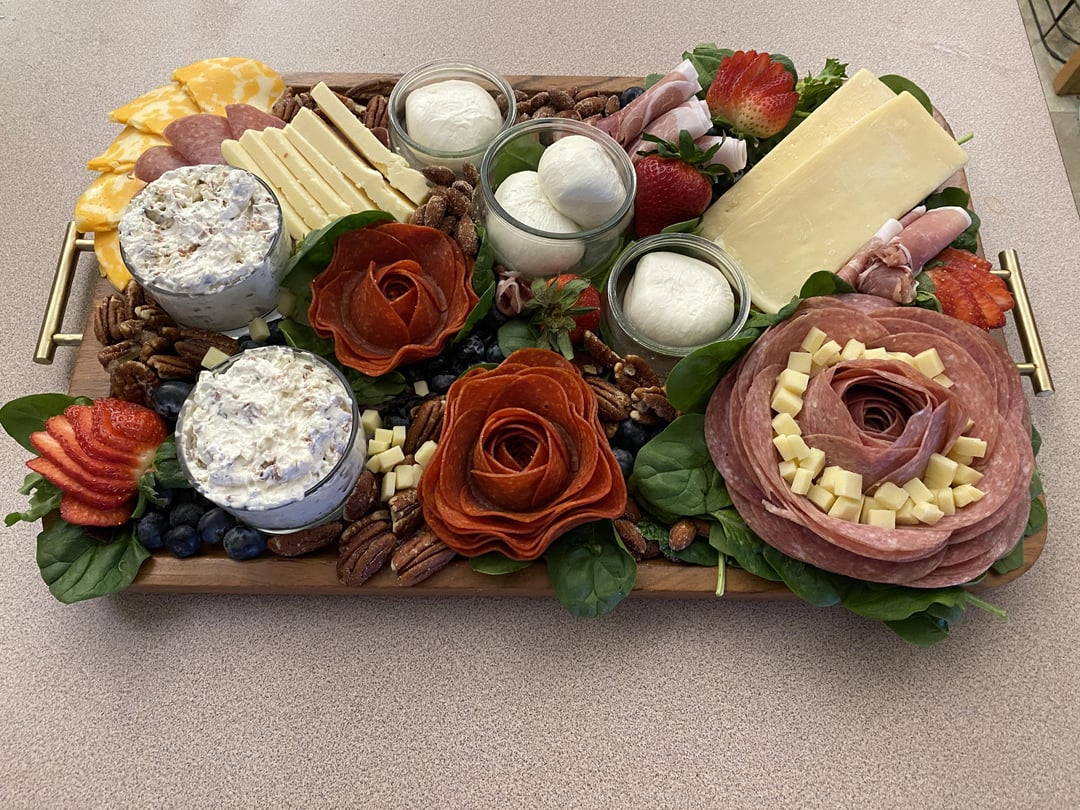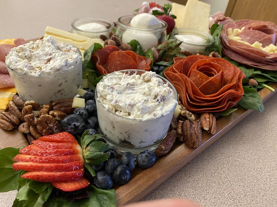 The actual board has a Satori romano, fontina, and 2 types of their cheddar offerings, belgioso burrata, and a simple sargento colby. Salted pecans and smokehouse almonds. I made a bacon cheddar ranch dip using whipped cream cheese, sour cream, satori cheddar, a good bacon, chives, scratch ranch seasonings (no pre bought seasoning). Meats I used some kretchmar salami and pepperoni, and some fancy prosciutto co I can’t spell nor pronounce. Garnished with blueberries, strawberries, spinach, and arugula. I roasted fresh garlic and mashed it w/ some evo, a nice parm reggiano, and spread it on a baguette and then toasted, second baguette is plain/toasted.